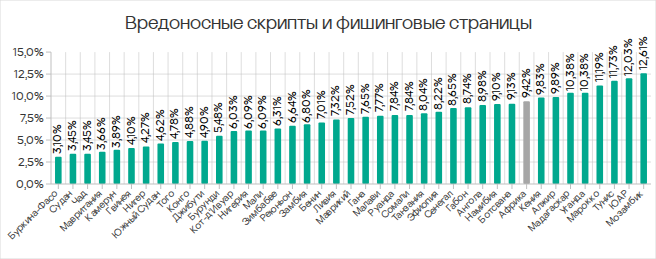 Среди стран региона по доле компьютеров АСУ, на которых были заблокированы вредоносные скрипты и фишинговые страницы, лидирует Мозамбик с 12,61%. Наименьший показатель — в Буркина-Фасо (3,10%).