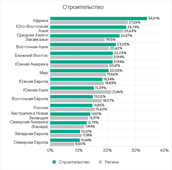 В Африке наиболее часто встречающейся с угрозами отраслью среди рассмотренных в отчете по-прежнему является строительство. По доле компьютеров АСУ, на которых в этой отрасли были заблокированы вредоносные объекты, Африка лидирует среди регионов.