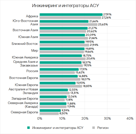 Африка находится на первом месте среди регионов по доле компьютеров АСУ, на которых были заблокированы вредоносные объекты в отрасли инжиниринг и интеграторы АСУ.