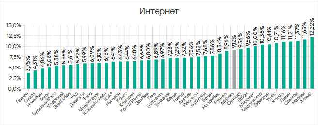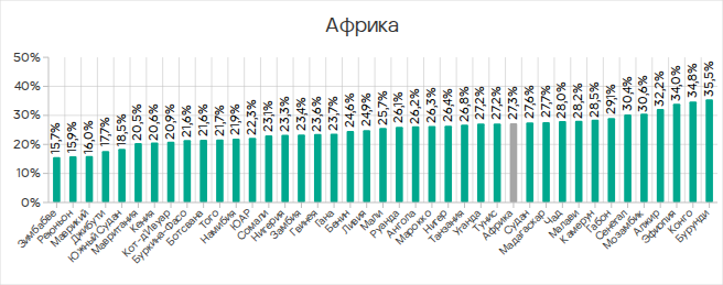 Ниже 20% показатель лишь в трех странах — в Зимбабве, на Маврикии и в Джибути. В Сенегале, Мозамбике, Алжире, Эфиопии, ДР Конго и Бурунди он превышает 30%.