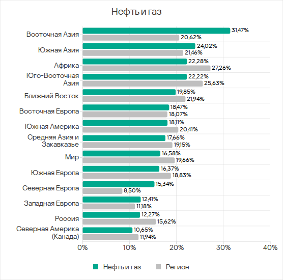 Африка находится на первом месте среди регионов по доле компьютеров АСУ, на которых были заблокированы вредоносные объекты в нефтегазовой отрасли.