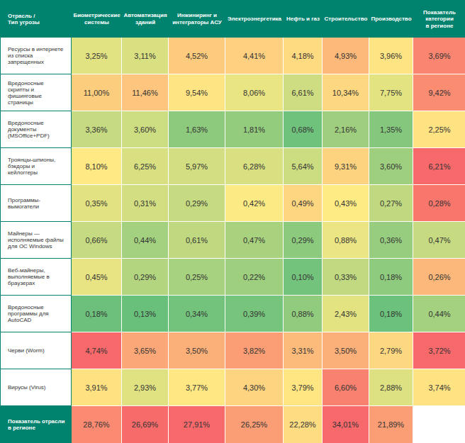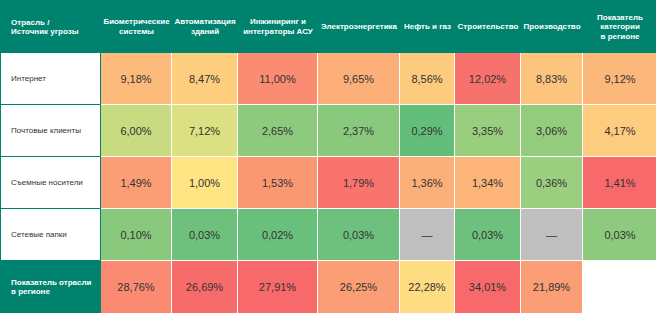 При оценке проблем отраслей в регионах мы используем тепловые карты. Цвет на карте определяет положение показателя в глобальном рейтинге отраслей в регионах (отдельно по каждой категории угроз или каждому источнику). Красный цвет указывает на то, что значение близко к максимальному.
