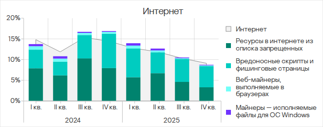 Основные категории угроз из интернета, которые в четвертом квартале 2025 года были заблокированы на компьютерах АСУ: вредоносные скрипты и фишинговые страницы, интернет-ресурсы из списка запрещенных и вредоносные документы.