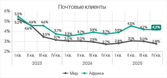 Доля компьютеров АСУ, на которых угрозы были заблокированы в почтовых клиентах, в Африке в четвертом квартале 2025 года составила 4,17%. Это в 6,5 раза выше, чем в Северной Европе, которая замыкает соответствующий рейтинг регионов.