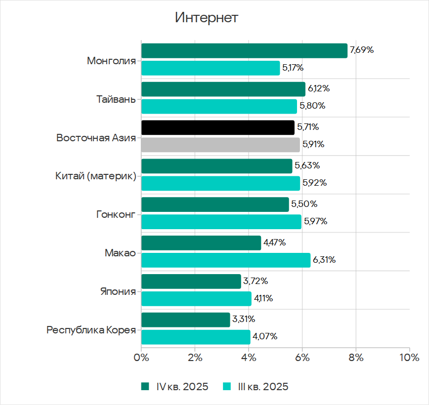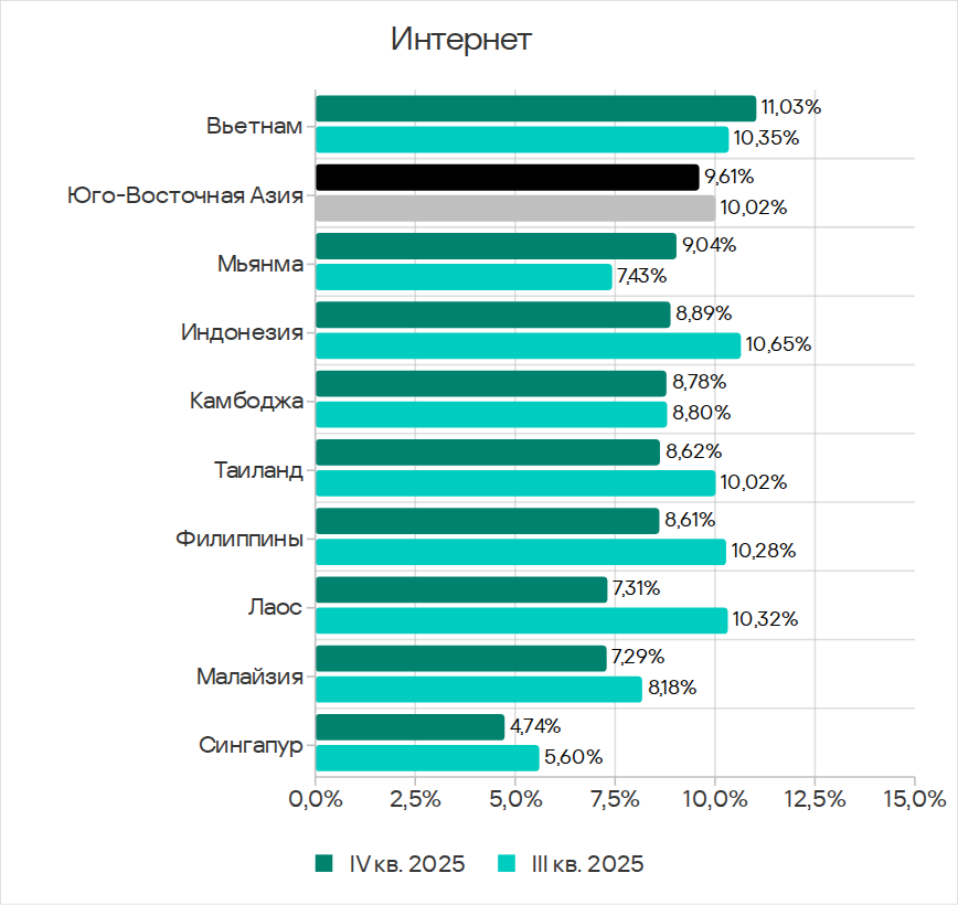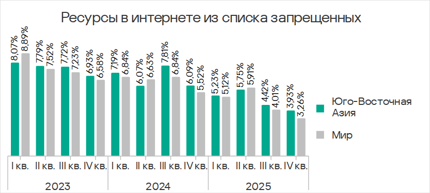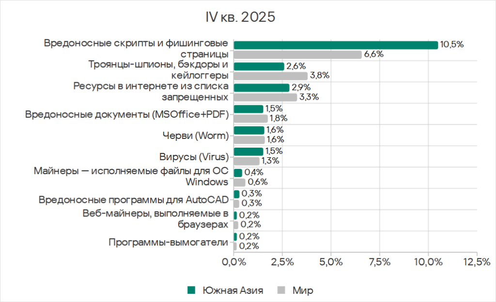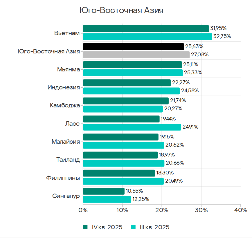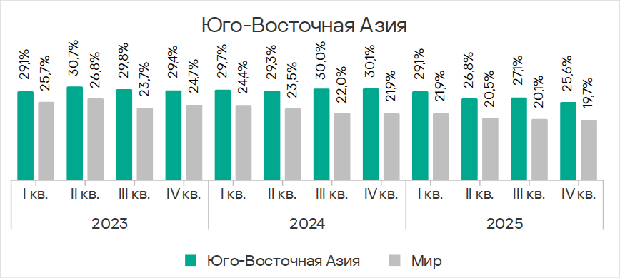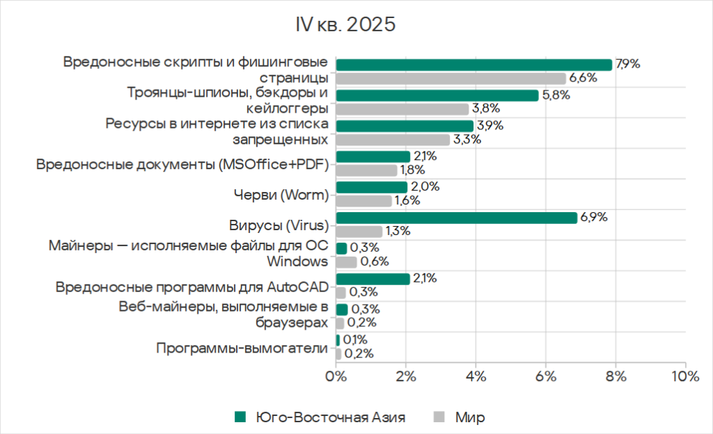 В четвертом квартале 2025 года Юго-Восточная Азия заняла второе место по доле компьютеров АСУ, на которых блокировались угрозы из интернета, и первое — по показателям ресурсов в интернете из списка запрещенных и веб-майнеров.