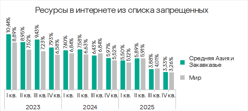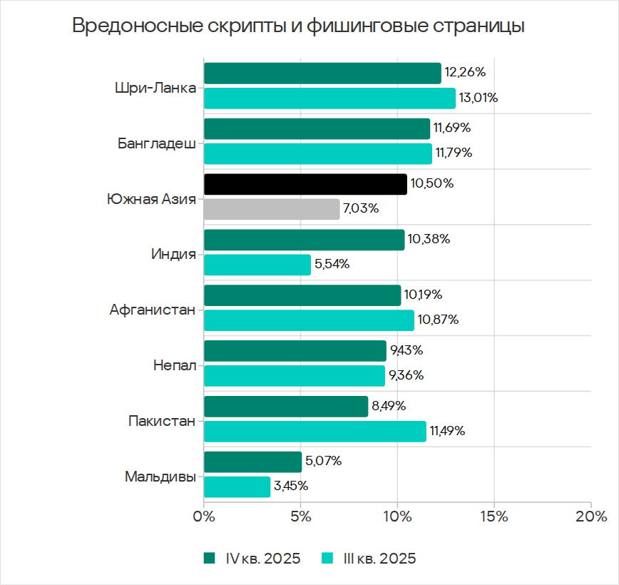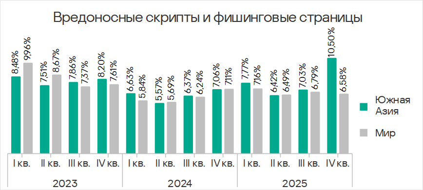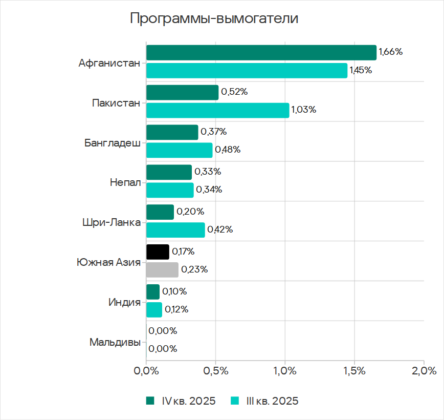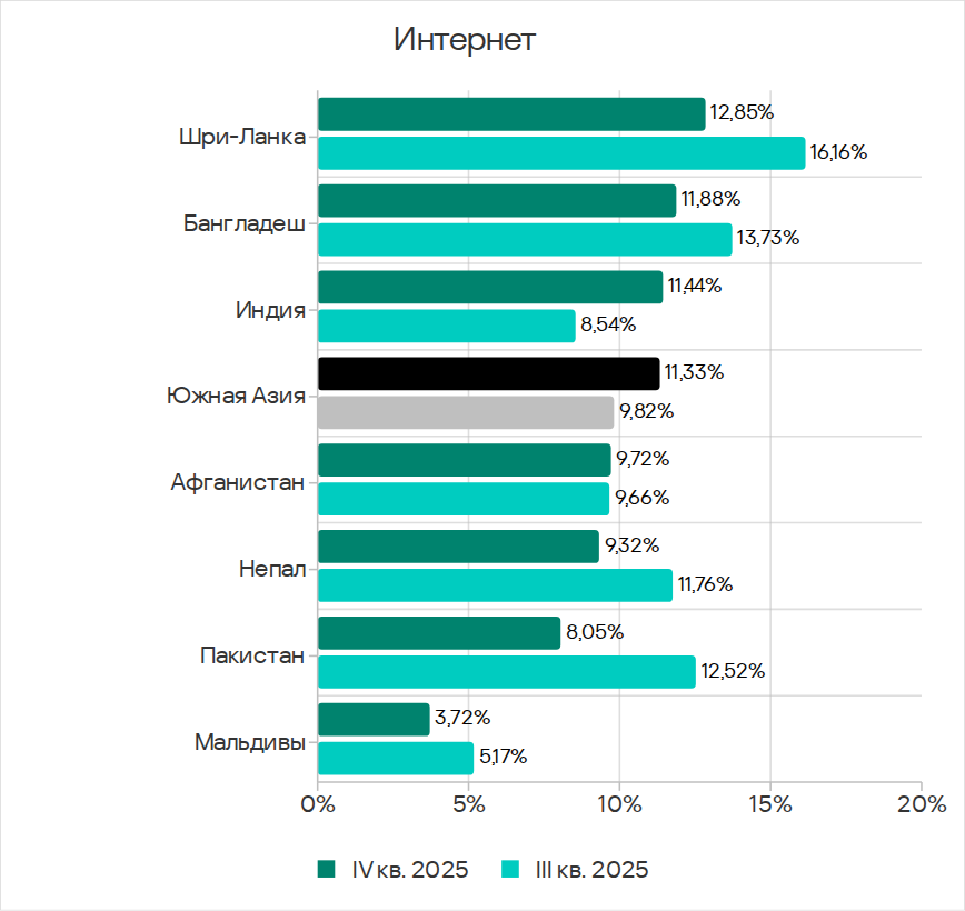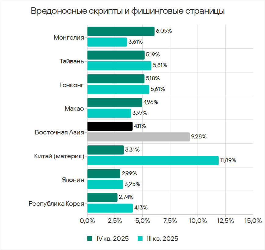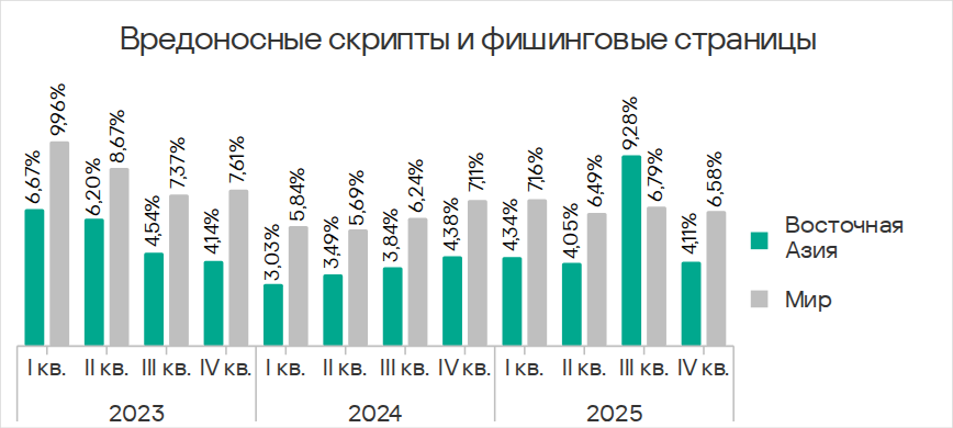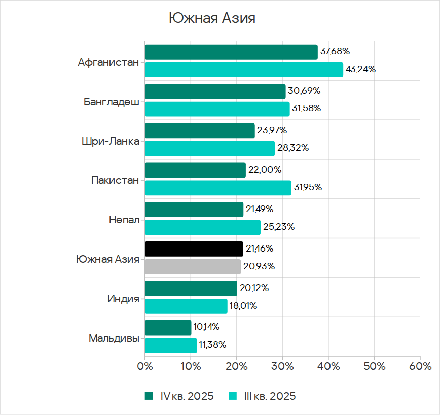 В четвертом квартале 2025 года Юго-Восточная Азия заняла второе место по доле компьютеров АСУ, на которых блокировались угрозы из интернета, и первое — по показателям ресурсов в интернете из списка запрещенных и веб-майнеров.
