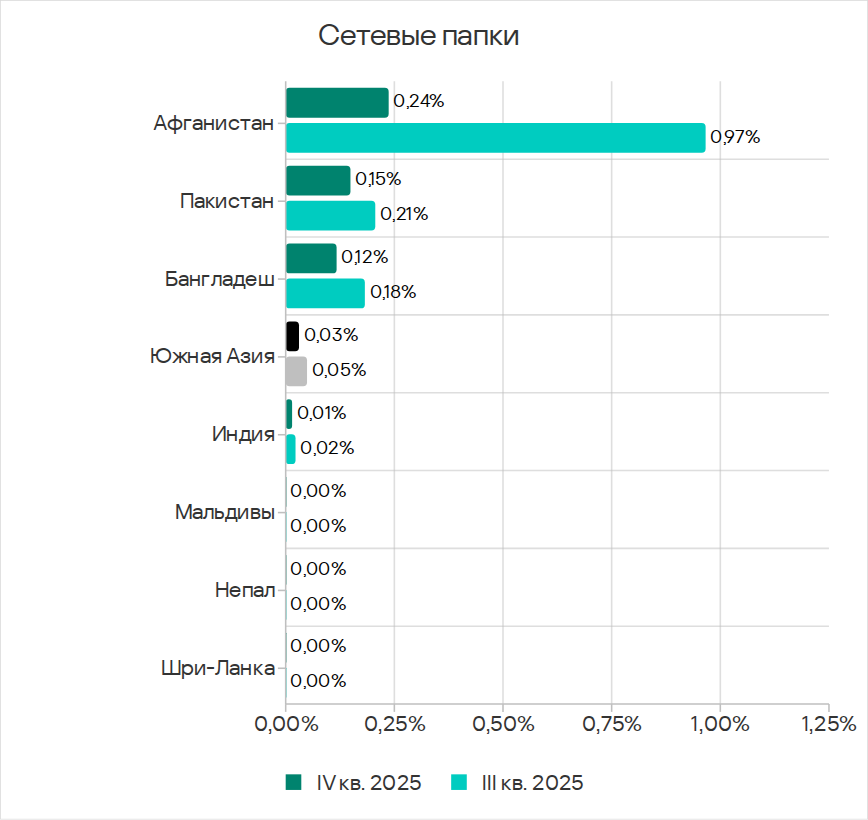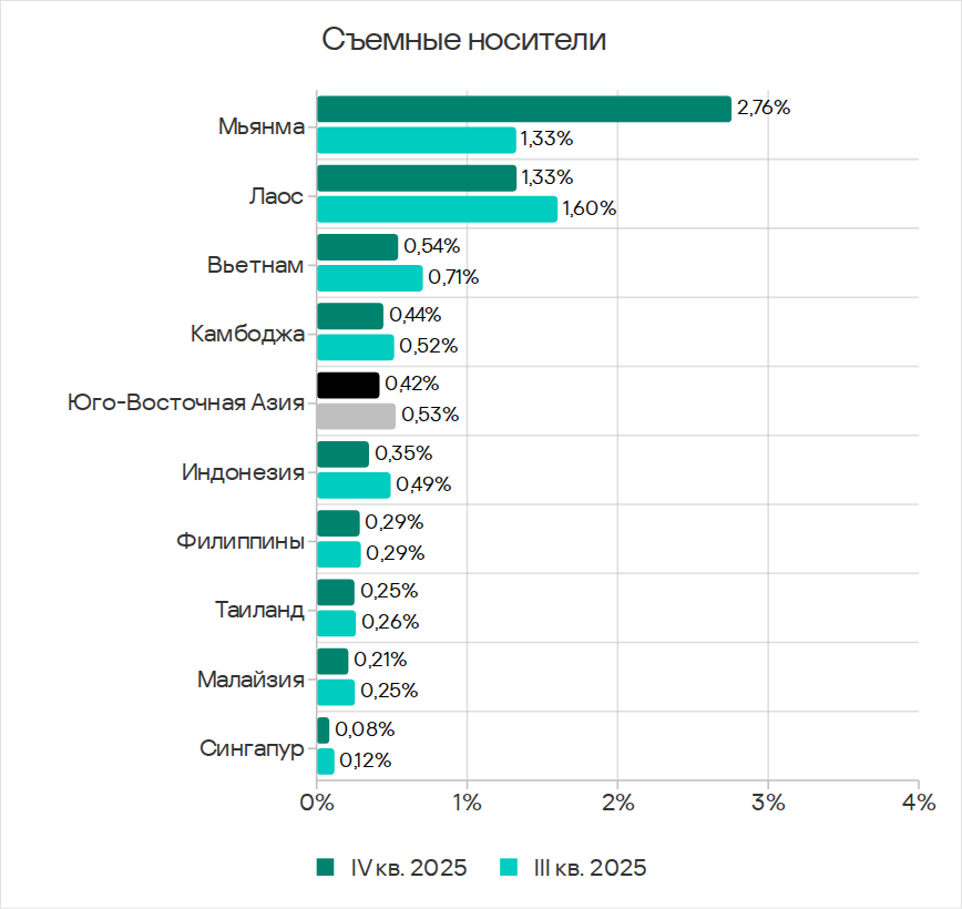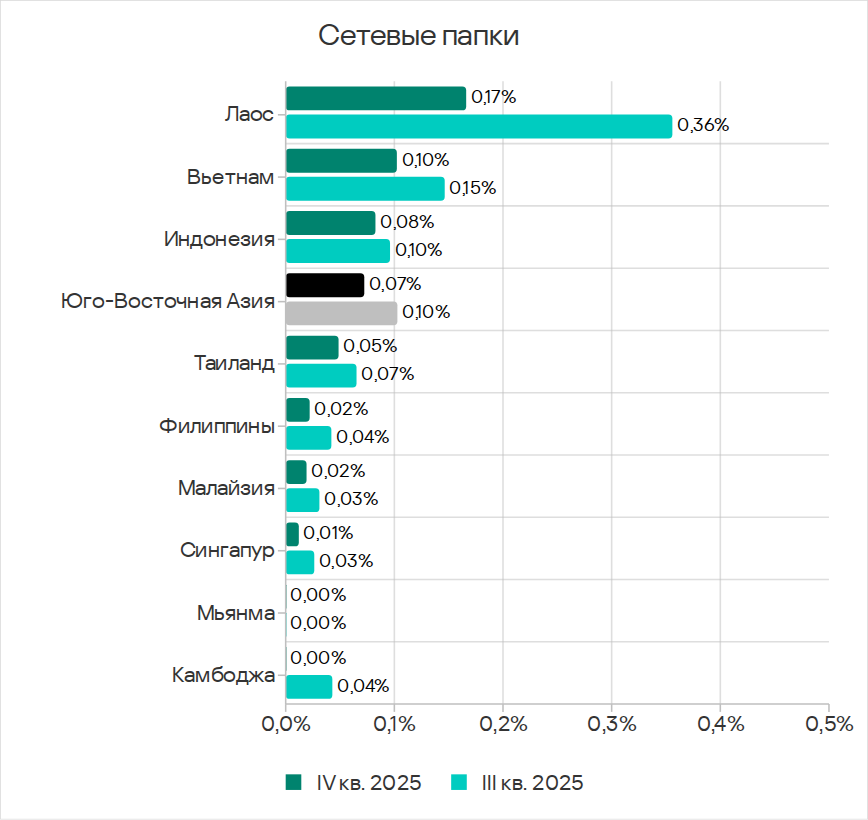 Среди стран региона по доле компьютеров АСУ, на которых были заблокированы угрозы в сетевых папках, в четвертом квартале 2025 года с заметным отрывом лидирует Лаос с 0,17%. Во всех странах региона, где были заблокированы угрозы в сетевых папках, показатели уменьшились.