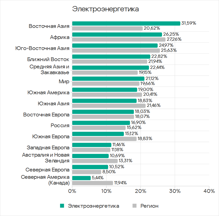 Средняя Азия и Закавказье находятся на пятом месте среди регионов по доле компьютеров АСУ, на которых были заблокированы вредоносные объекты в электроэнергетической отрасли.