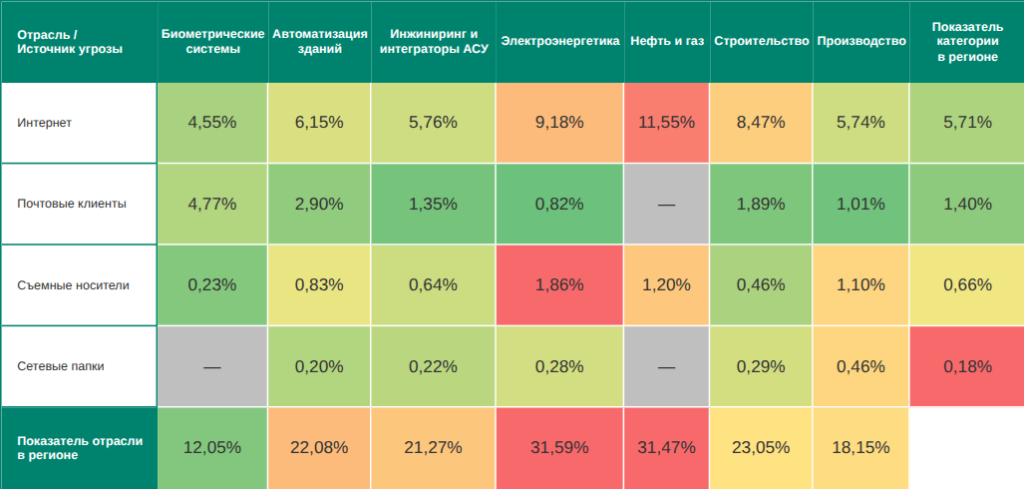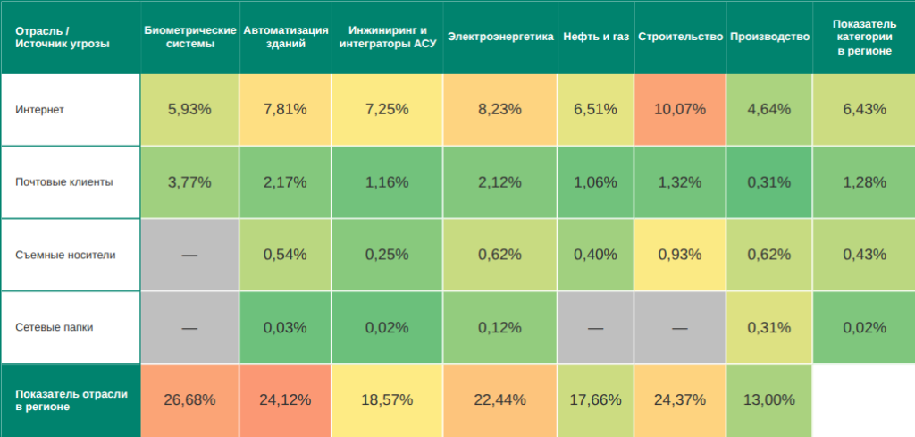 - третье место по угрозам из интернета, на съемных носителях и в сетевых папках;