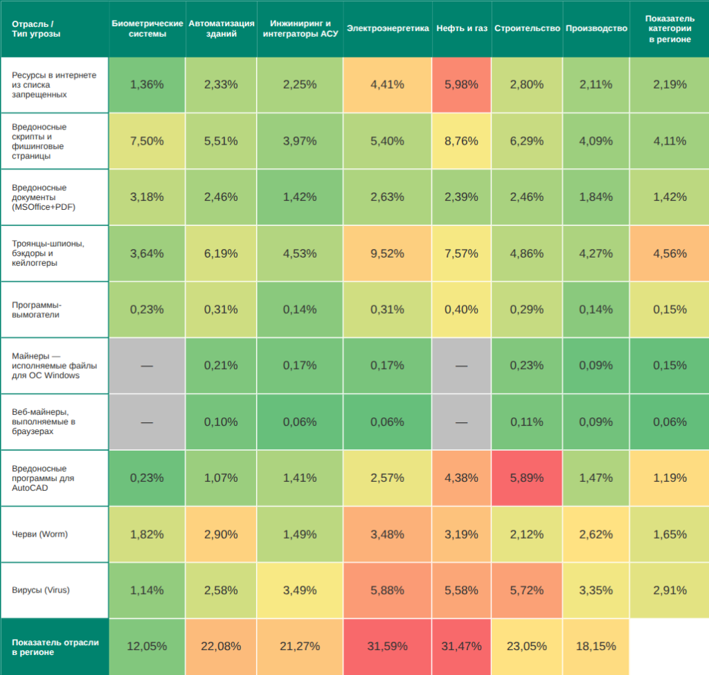 Средняя Азия и Закавказье находятся на девятом месте среди регионов по доле компьютеров АСУ, на которых были заблокированы вредоносные объекты в отрасли.