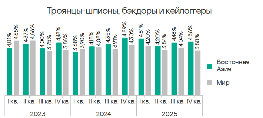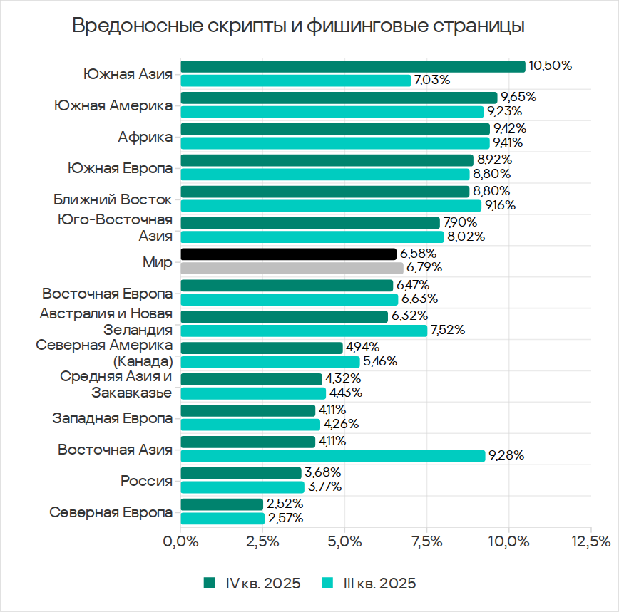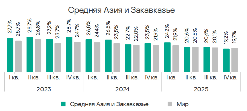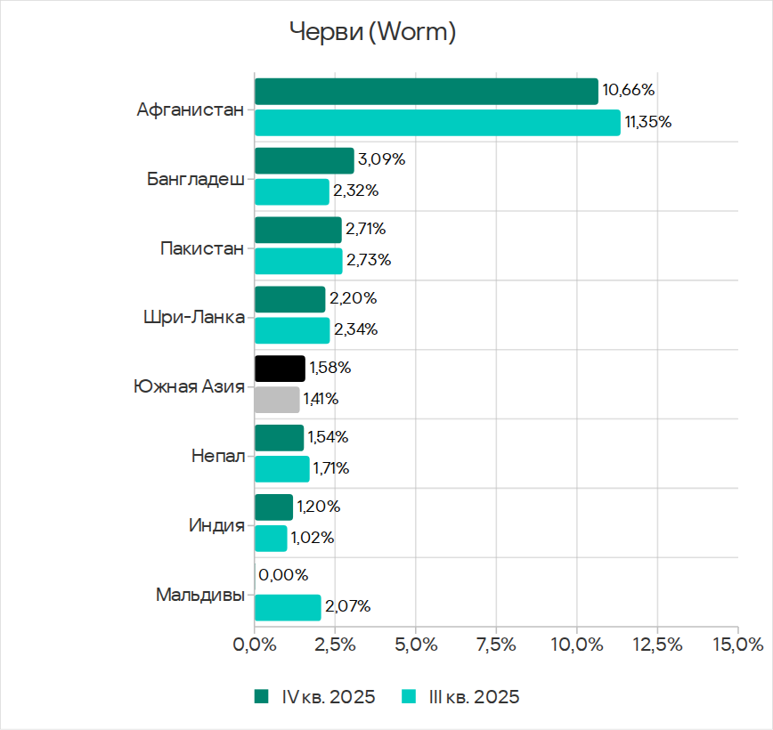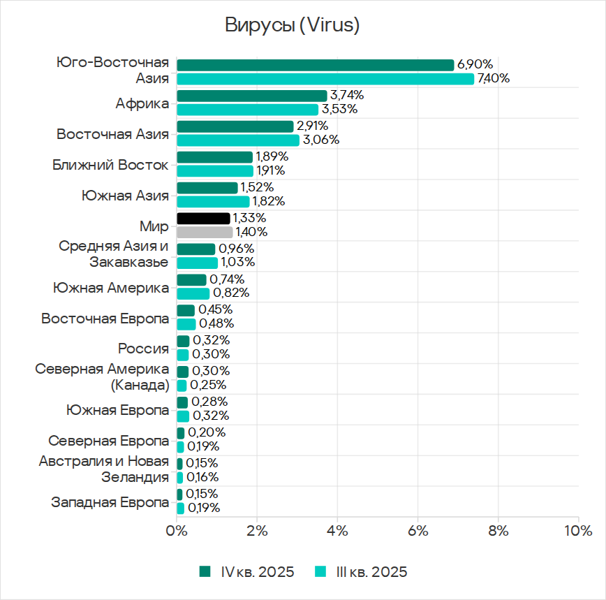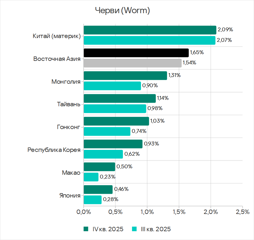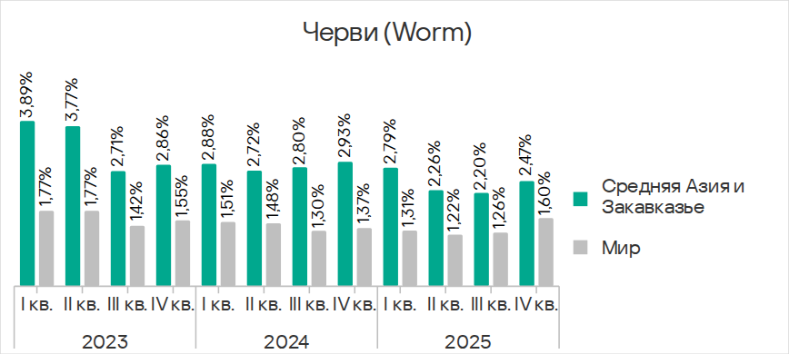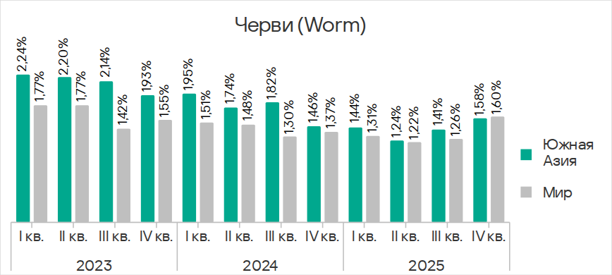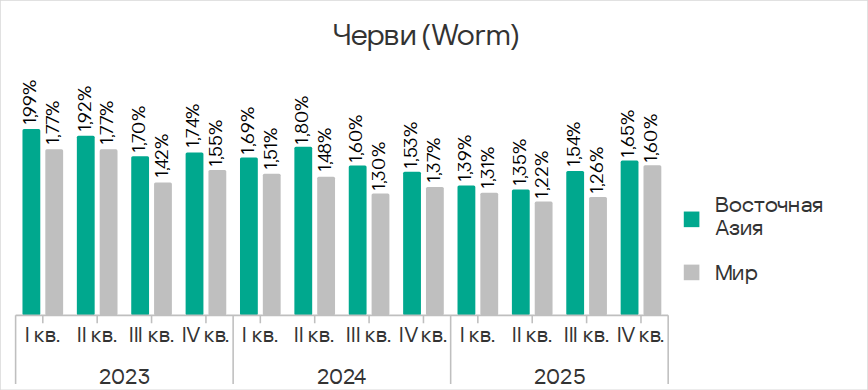 В четвертом квартале 2025 года показатель червей вырос во всех регионах вследствие очередной волны фишинговых кампаний Curriculum-vitae-catalina, о которой мы рассказывали выше.