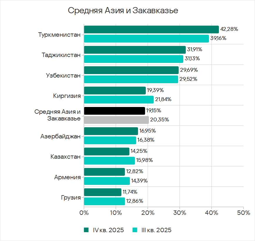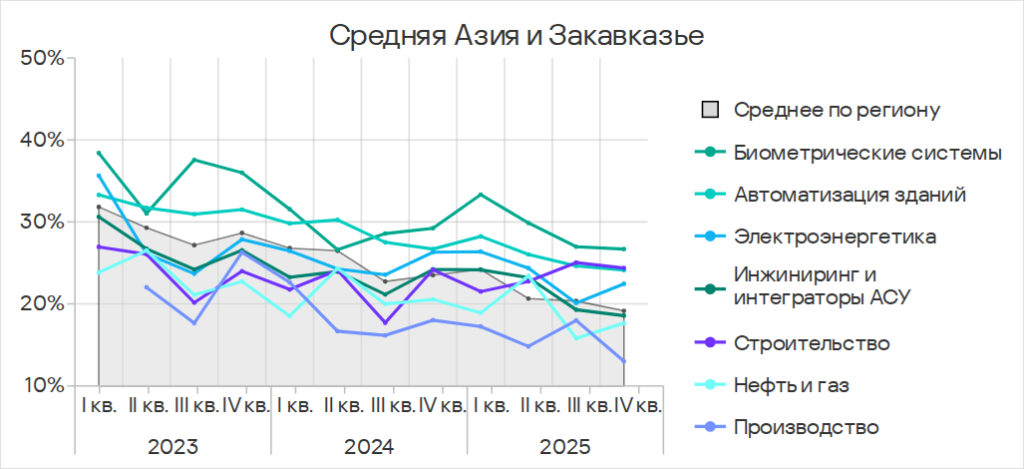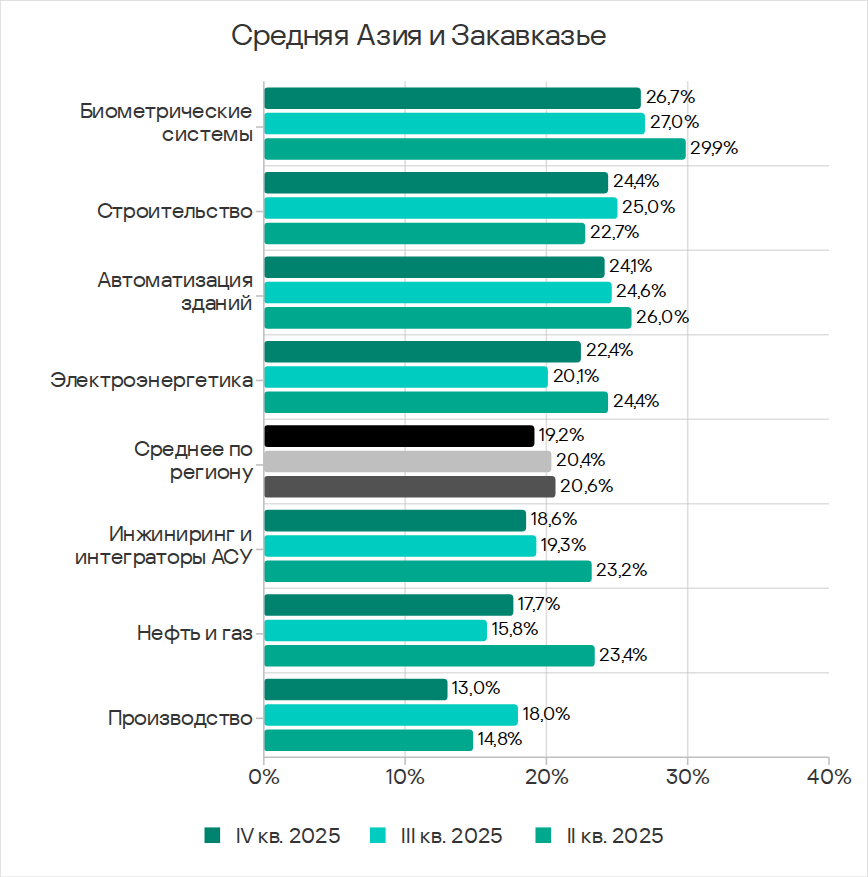 Показатели категорий угроз в отраслях в Средней Азии и Закавказье, IV квартал 2025 года
