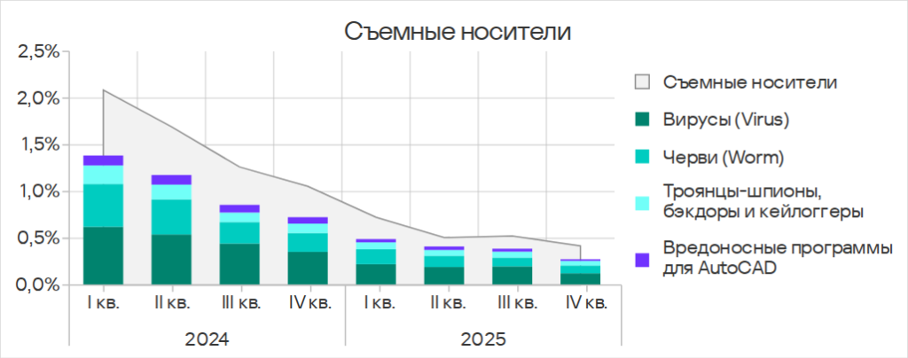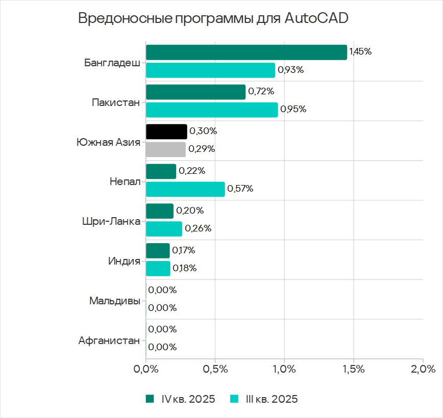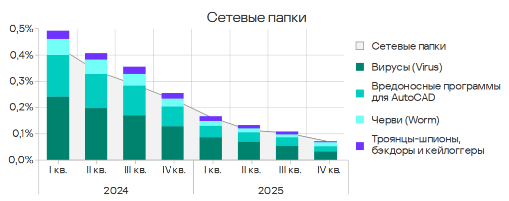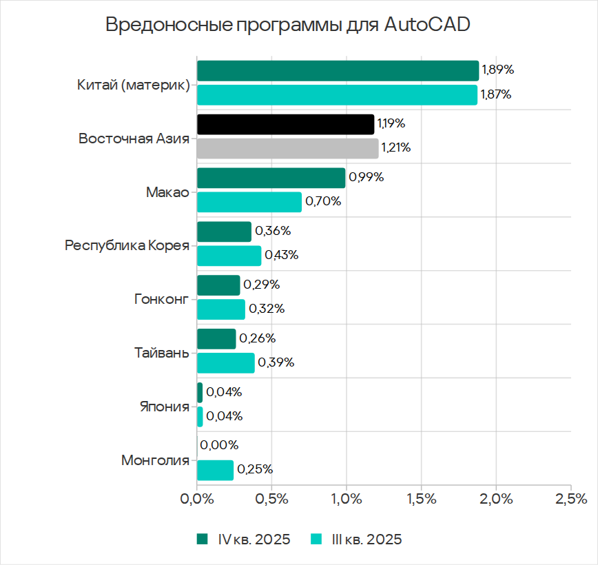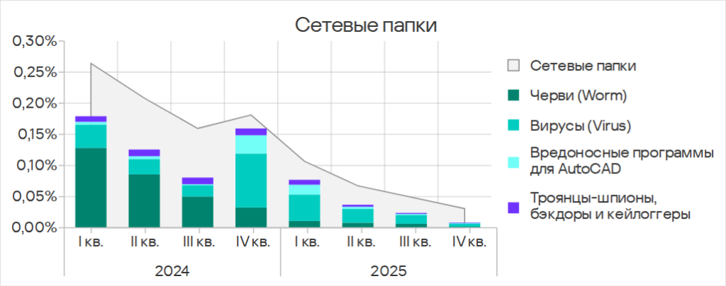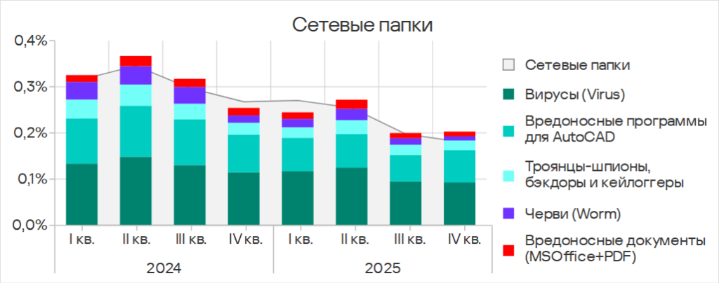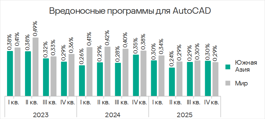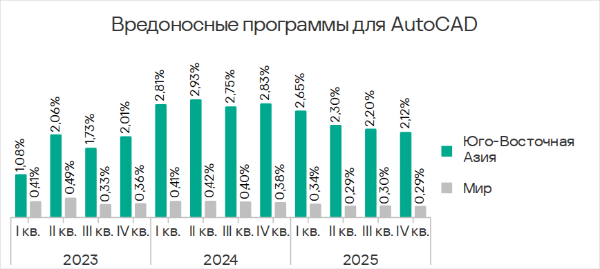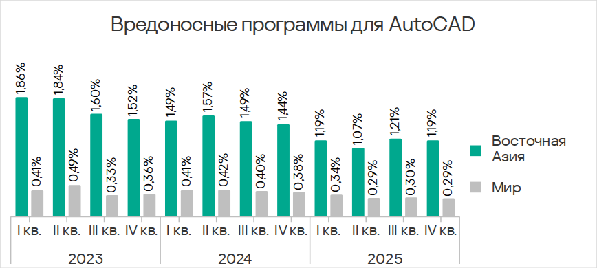 Показатели обеих категорий заметно выросли в 2024 году, но в 2025 году отмечен явный тренд на их снижение. В четвертом квартале 2025 года и у вирусов, и у вредоносных программ для AutoCAD показатель был наименьшим с начала 2024 года.