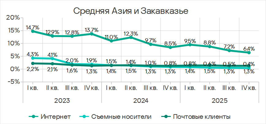 Показатель программ-вымогателей в Средней Азии и Закавказье довольно стабилен, за квартал он немного уменьшился.