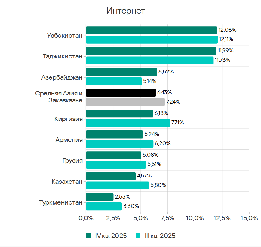 Среди стран региона по доле компьютеров АСУ, на которых были заблокированы черви, лидирует Туркмения с 11,64%. Показатель за квартал увеличился во всех странах региона, кроме Армении.