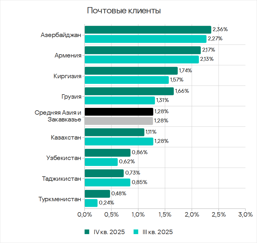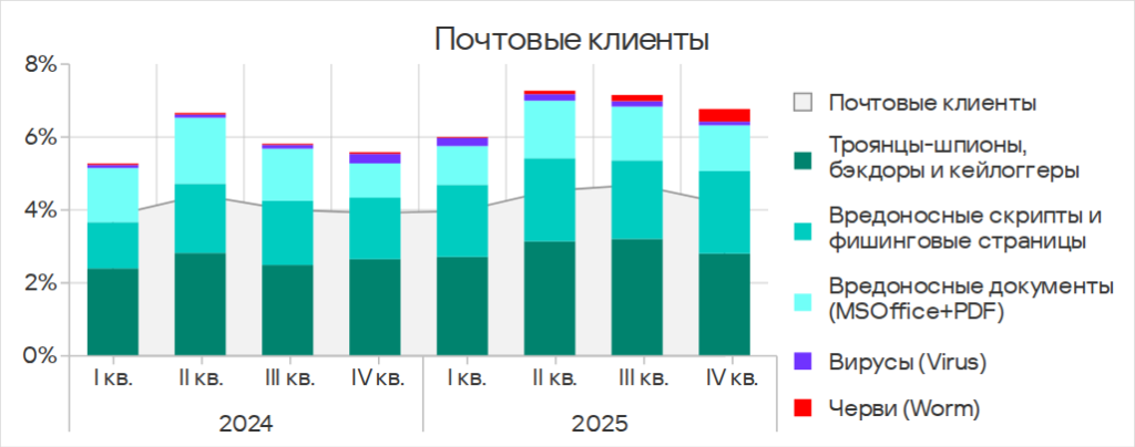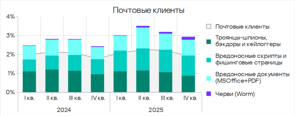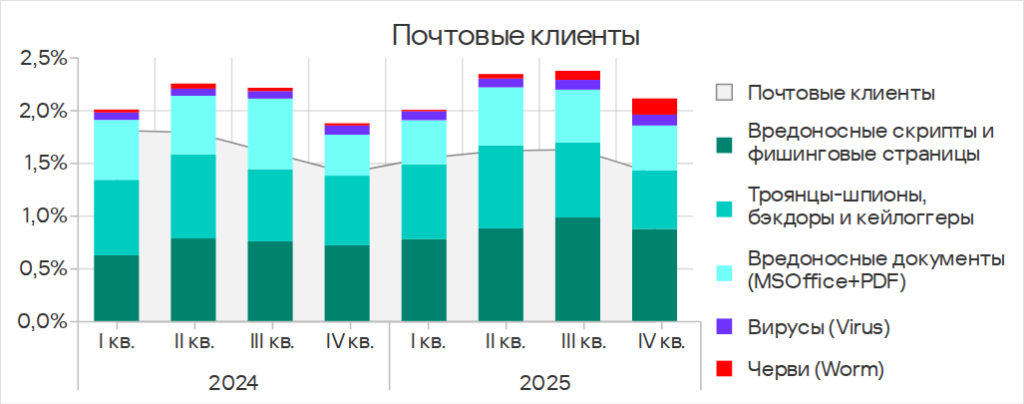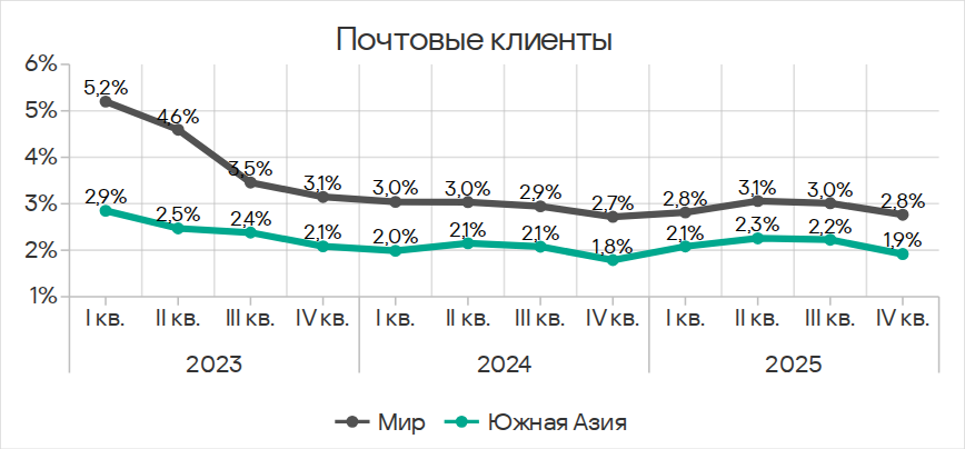 - третье место по угрозам в почтовых клиентах;