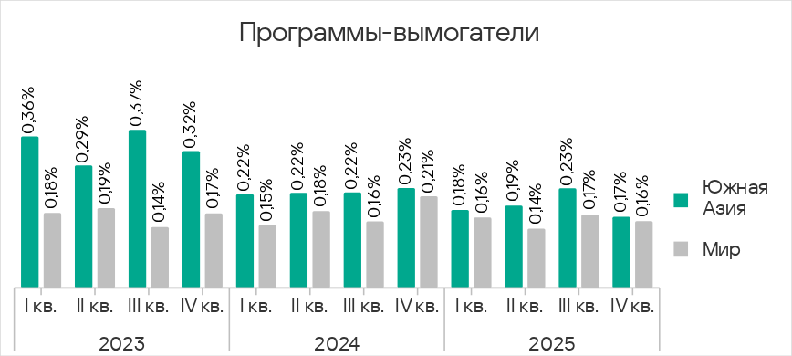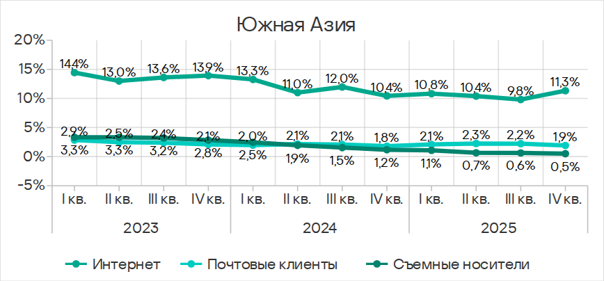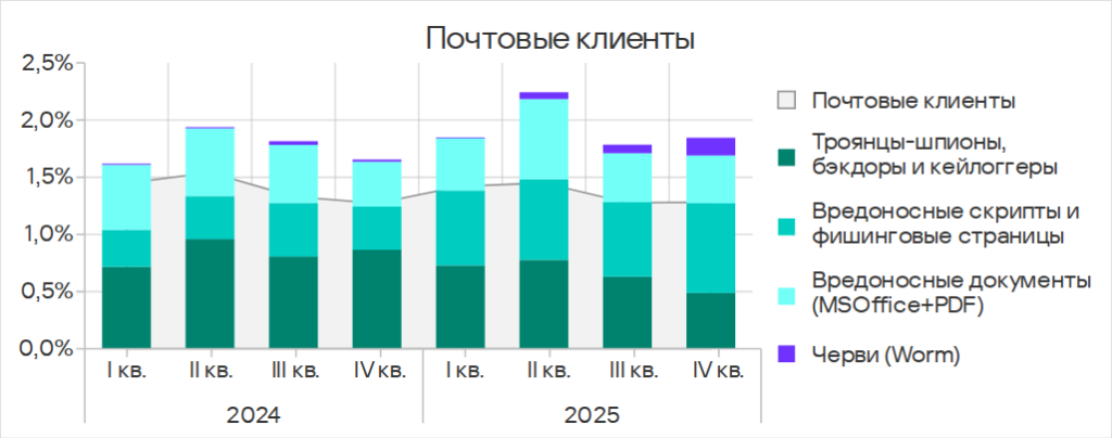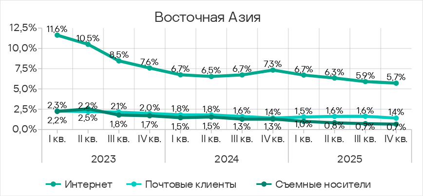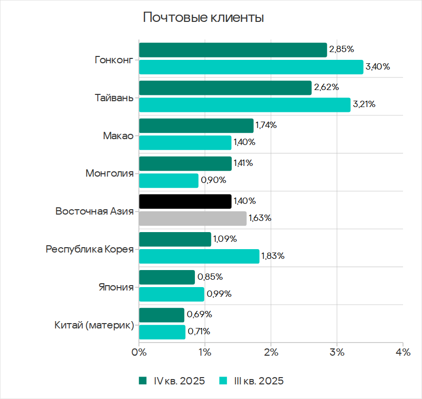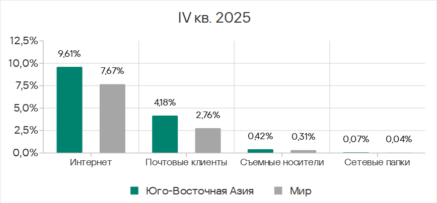 В четвертом квартале 2025 года заметно увеличилась доля компьютеров АСУ, на которых блокировались черви из почтовых клиентов. Это связано с очередной волной фишинговых кампаний, известных как Curriculum-vitae-catalina, в ходе которых были атакованы организации во всех регионах мира. В Юго-Восточной Азии пик атаки пришелся на ноябрь.
