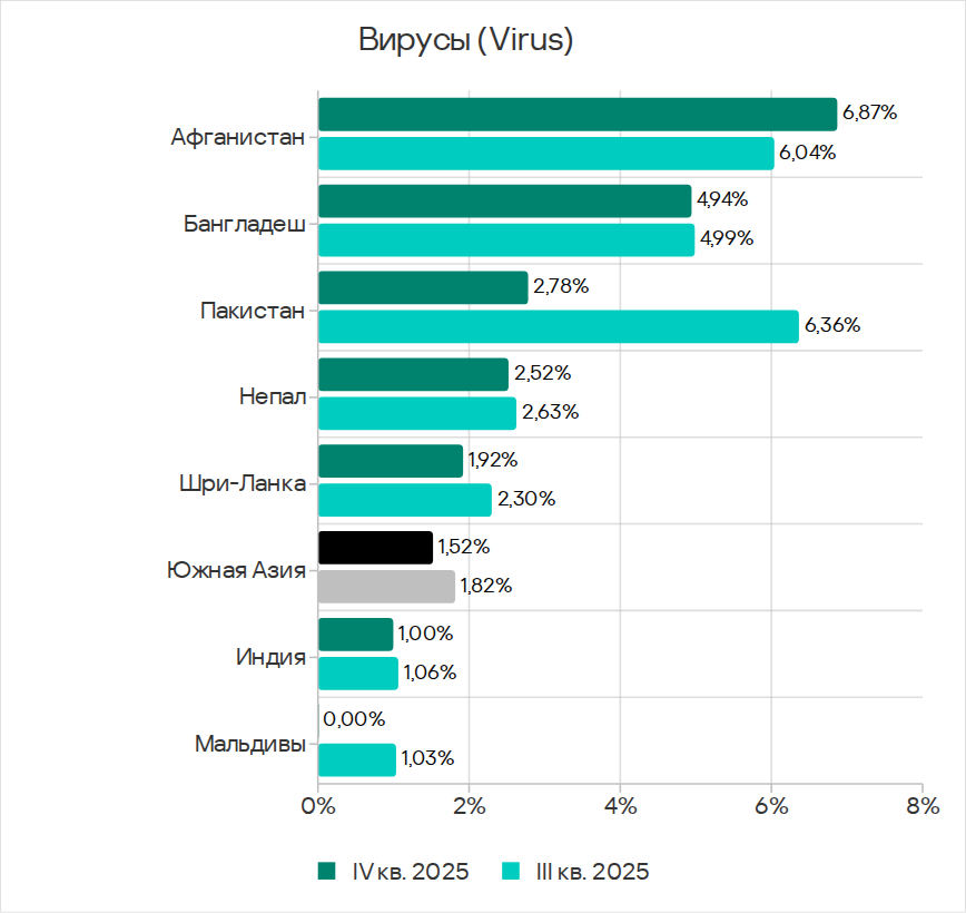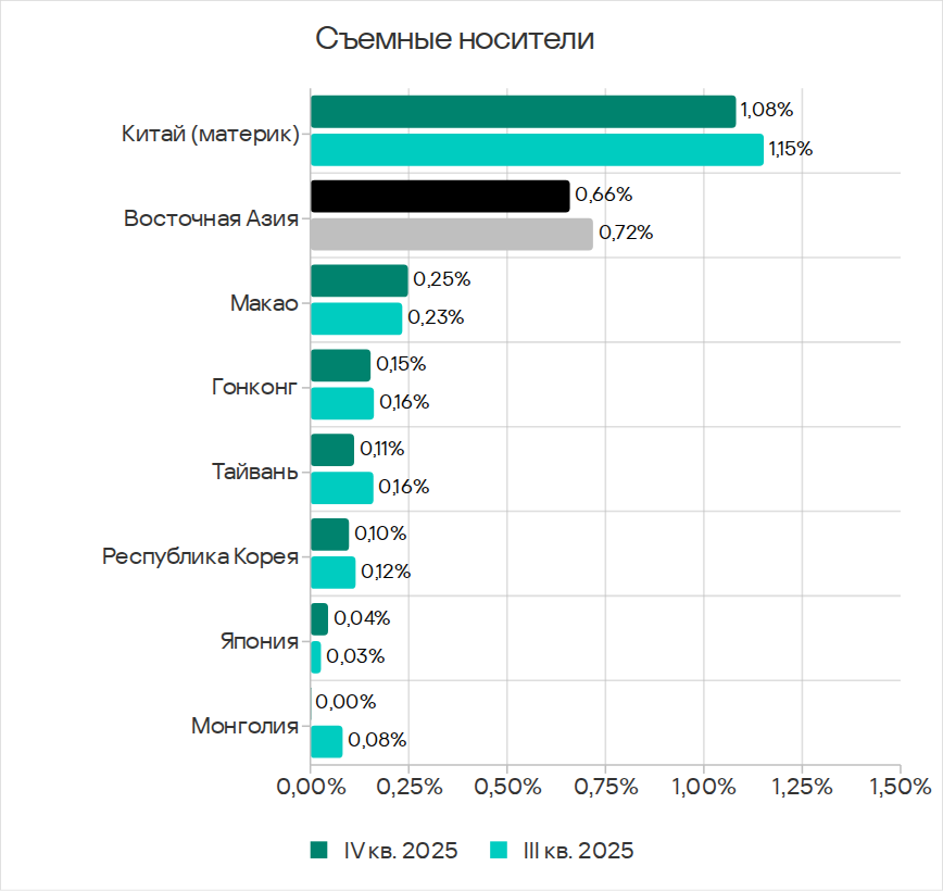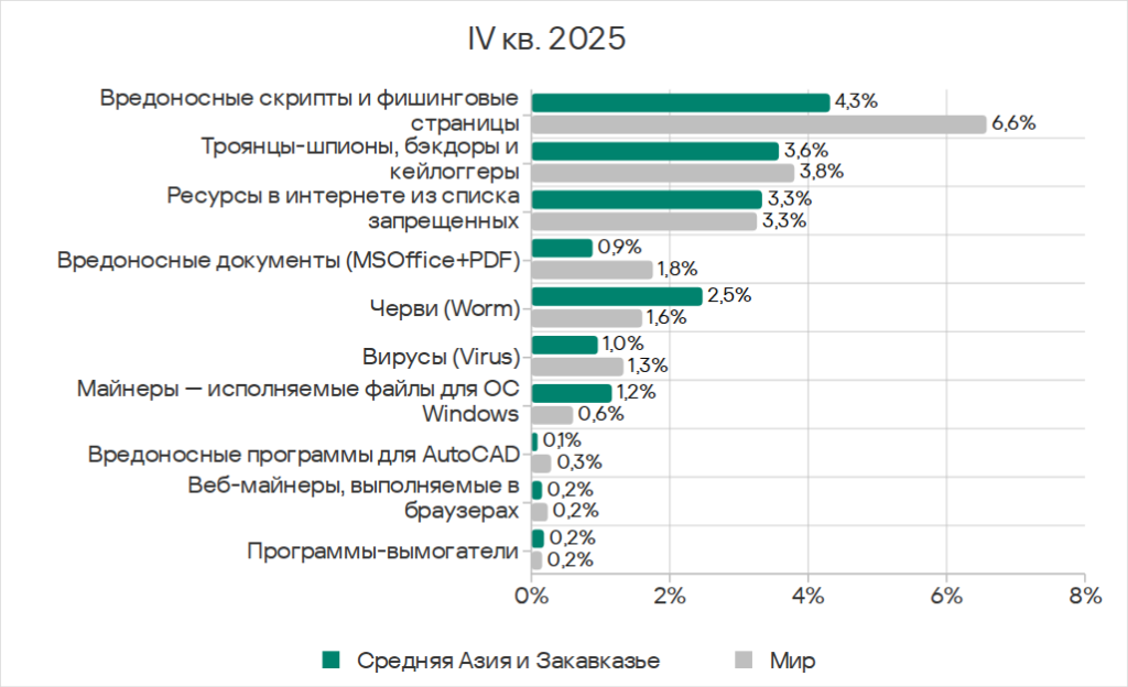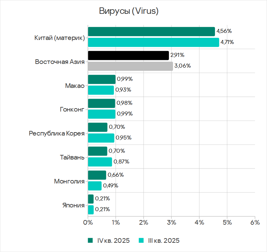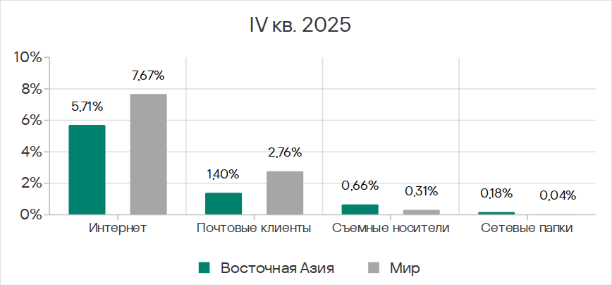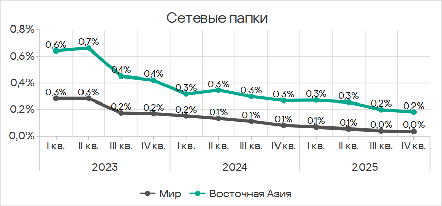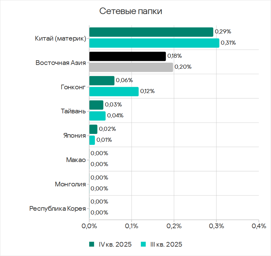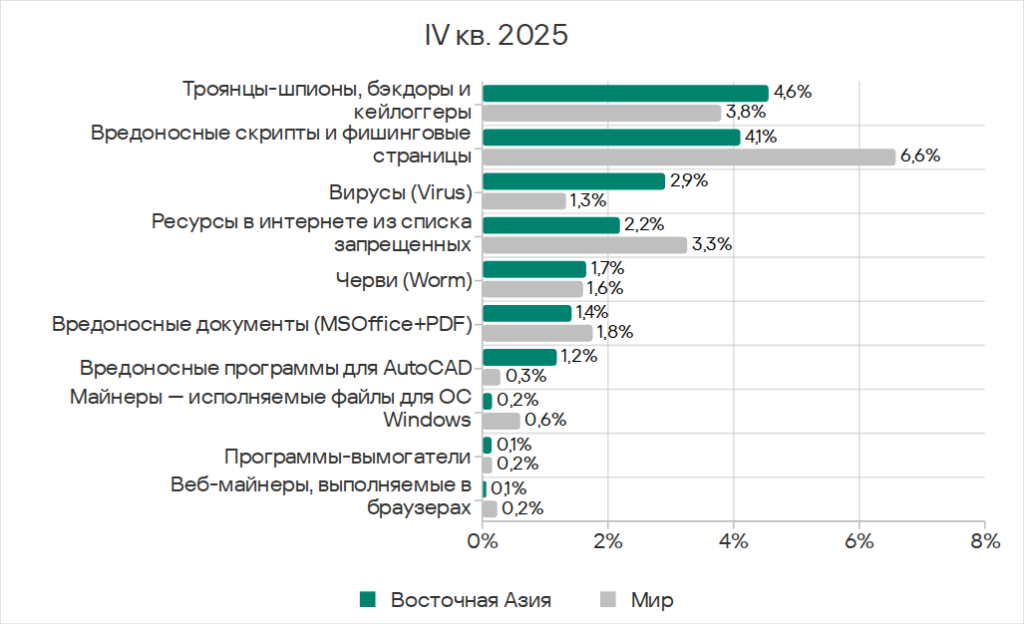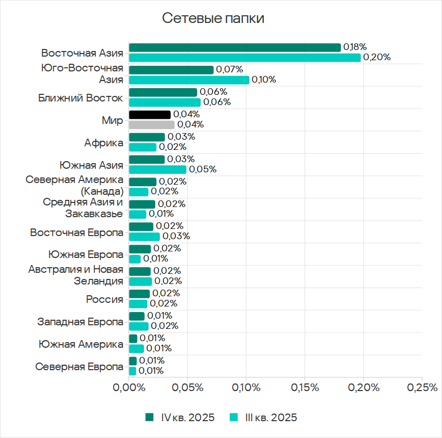 Основными категориями угроз, которые распространяются через сетевые папки, в четвертом квартале 2025 года стали вирусы, вредоносное ПО для AutoCAD, черви. По показателю вредоносного ПО для AutoCAD Юго-Восточная Азия с большим отрывом лидирует среди регионов.