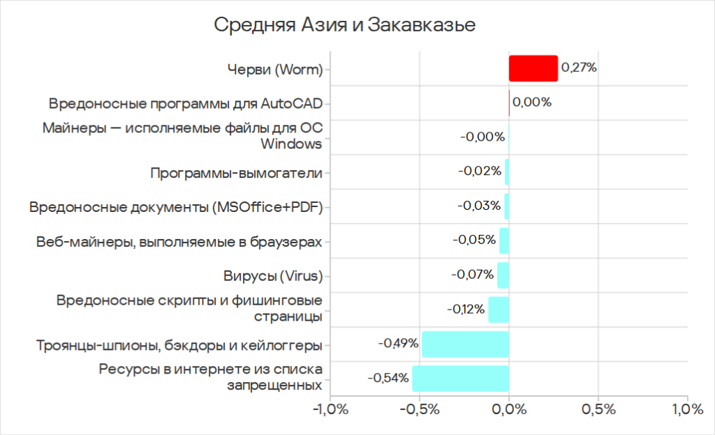 Еще одна актуальная угроза — черви. По показателю червей во всех отраслях, кроме производственной отрасли, Средняя Азия и Закавказье занимают второе или третье места в соответствующих рейтингах регионов.