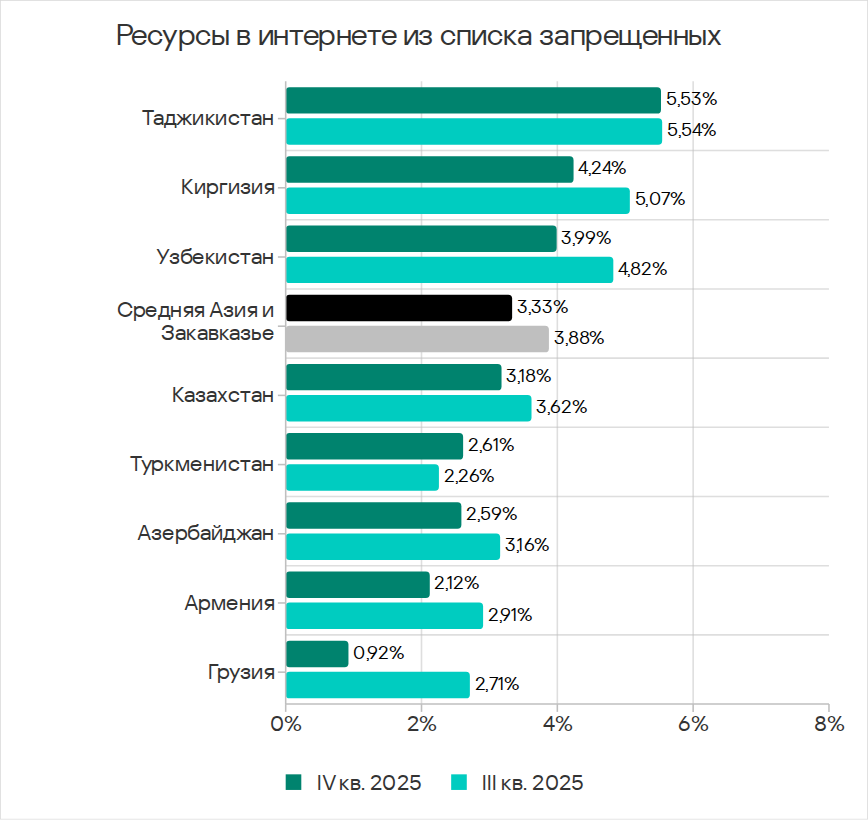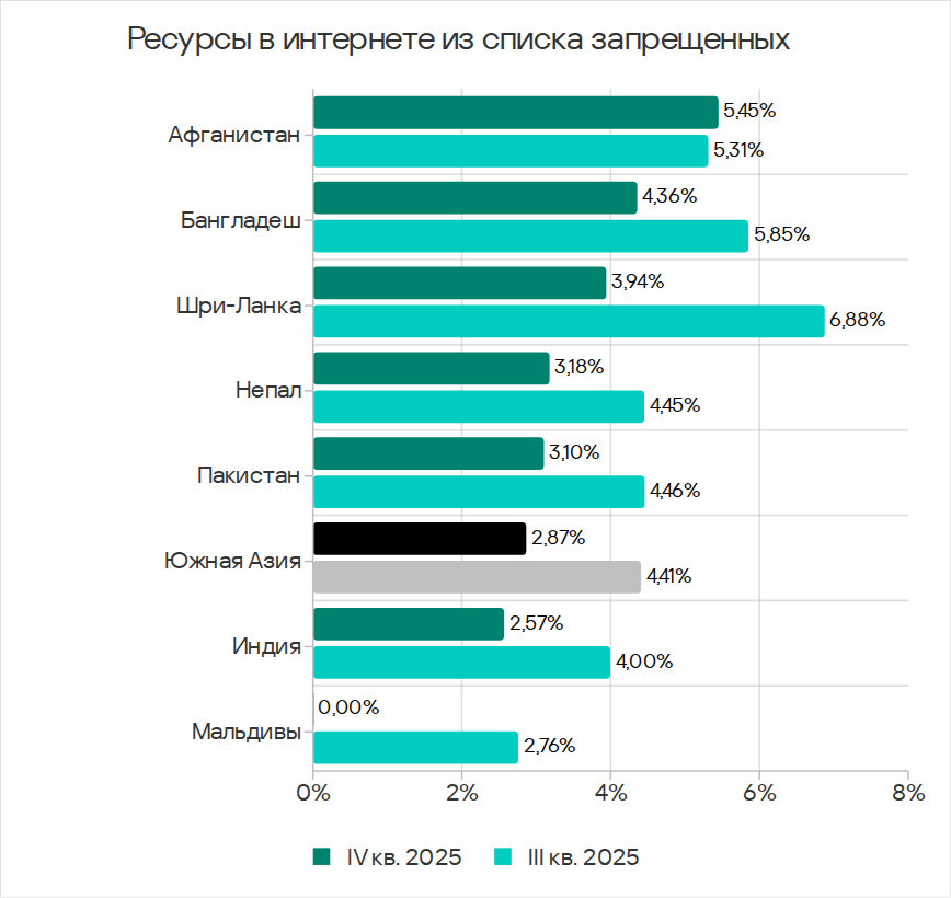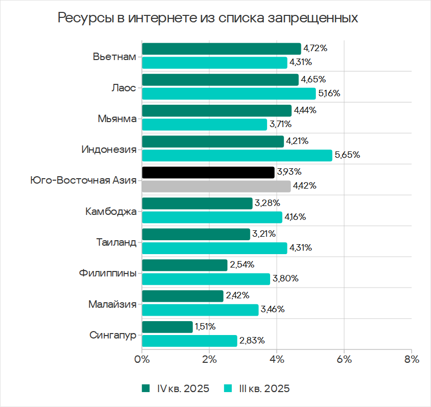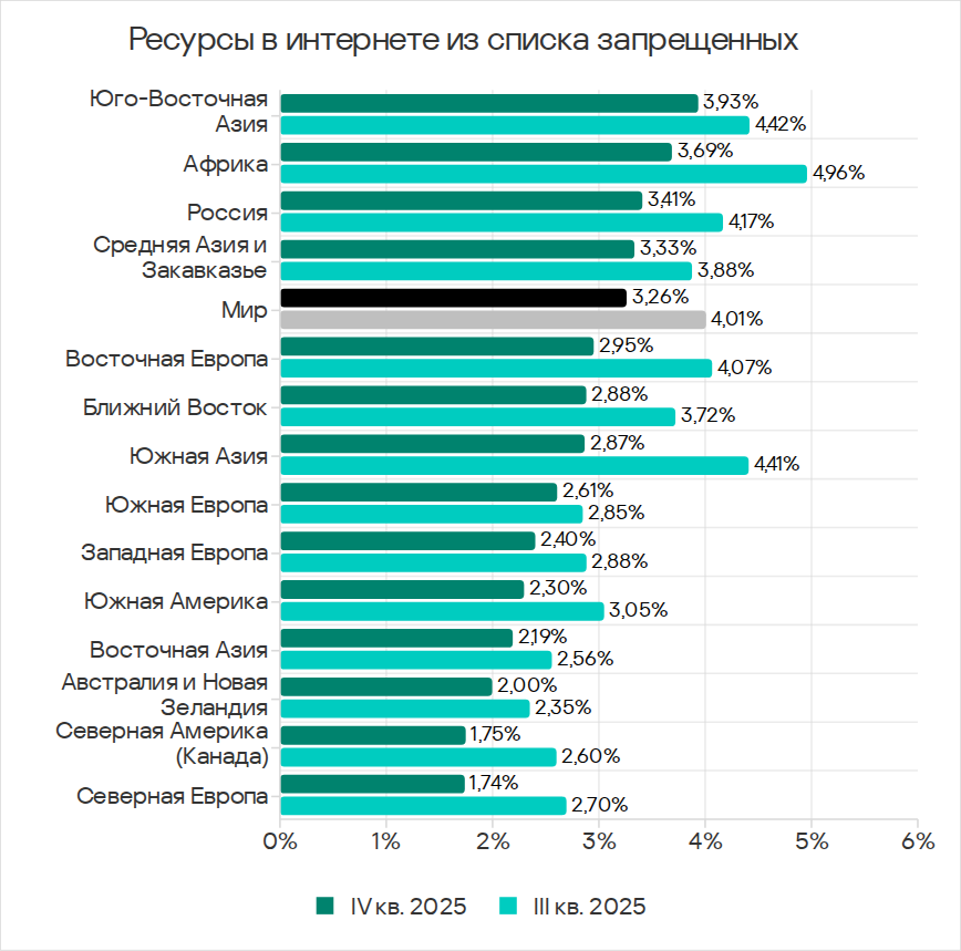 В рейтинге регионов по доле компьютеров АСУ, на которых блокируются ресурсы в интернете из списка запрещенных, Юго-Восточная Азия в четвертом квартале 2025 года потеснила Африку и заняла первое место с 3,93%. Это в 2,2 раза больше показателя Северной Европы, которая замыкает рейтинг.