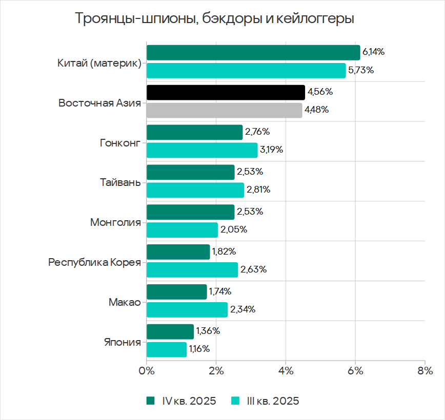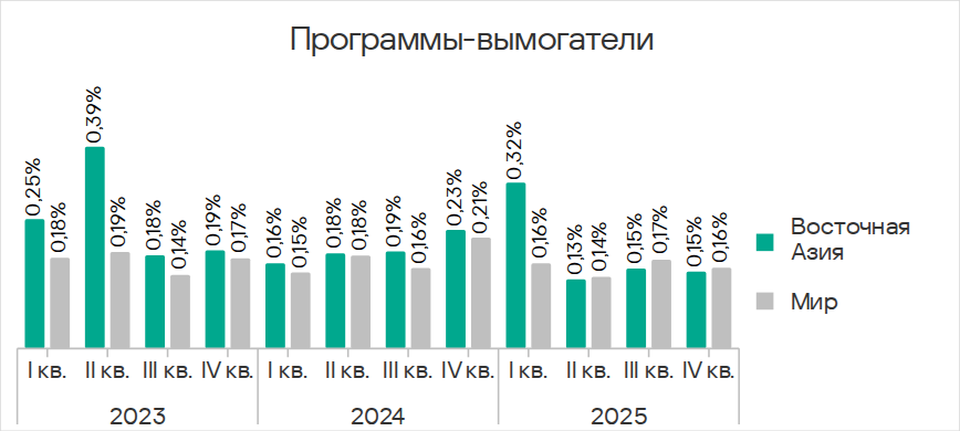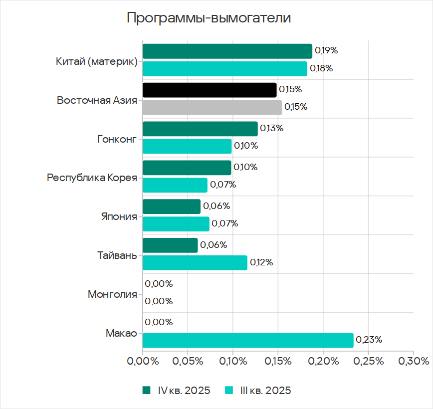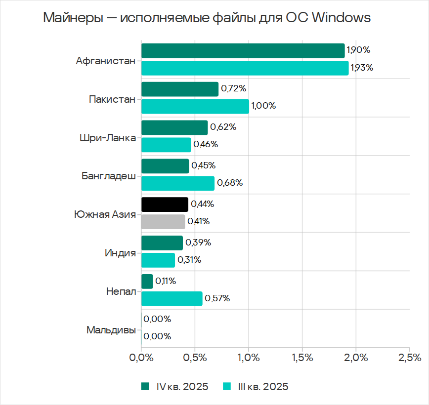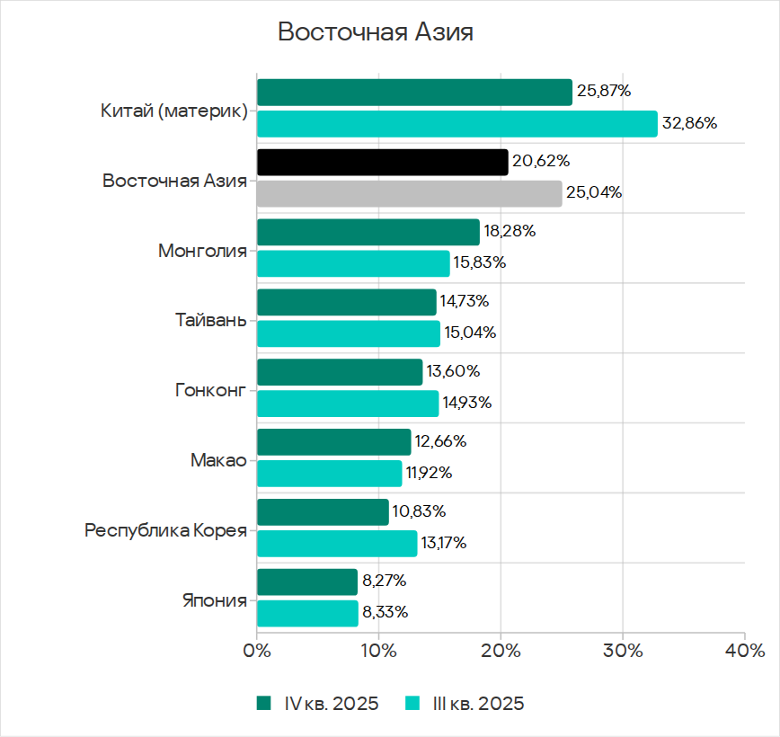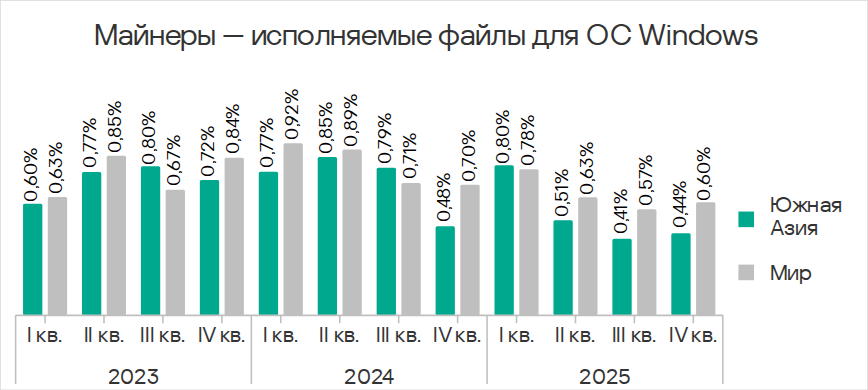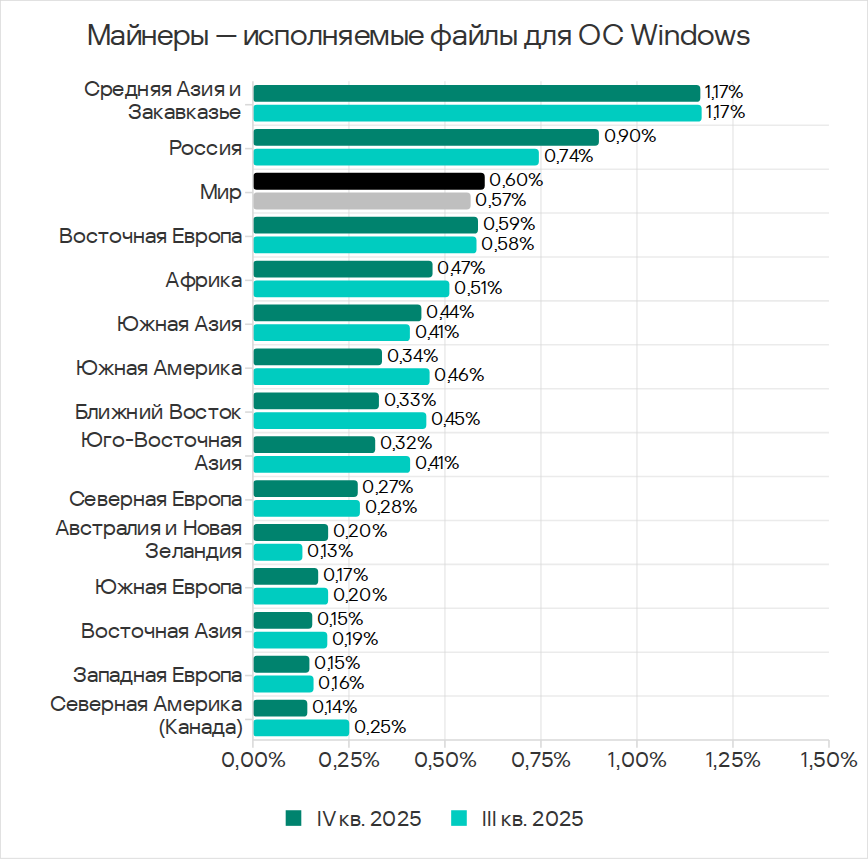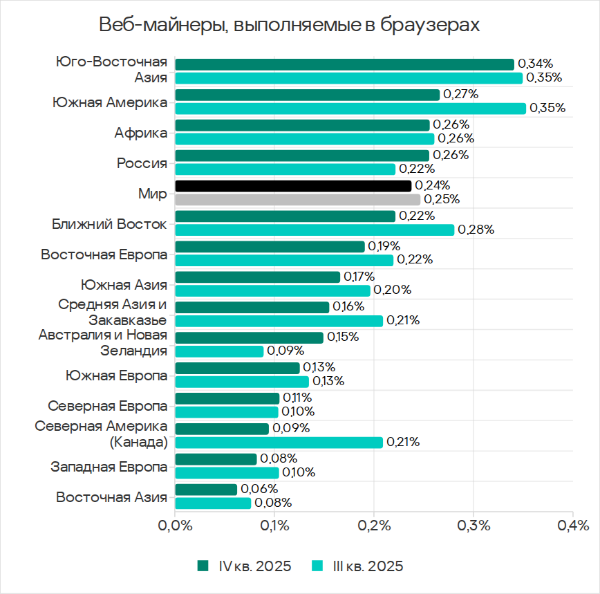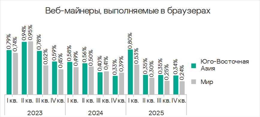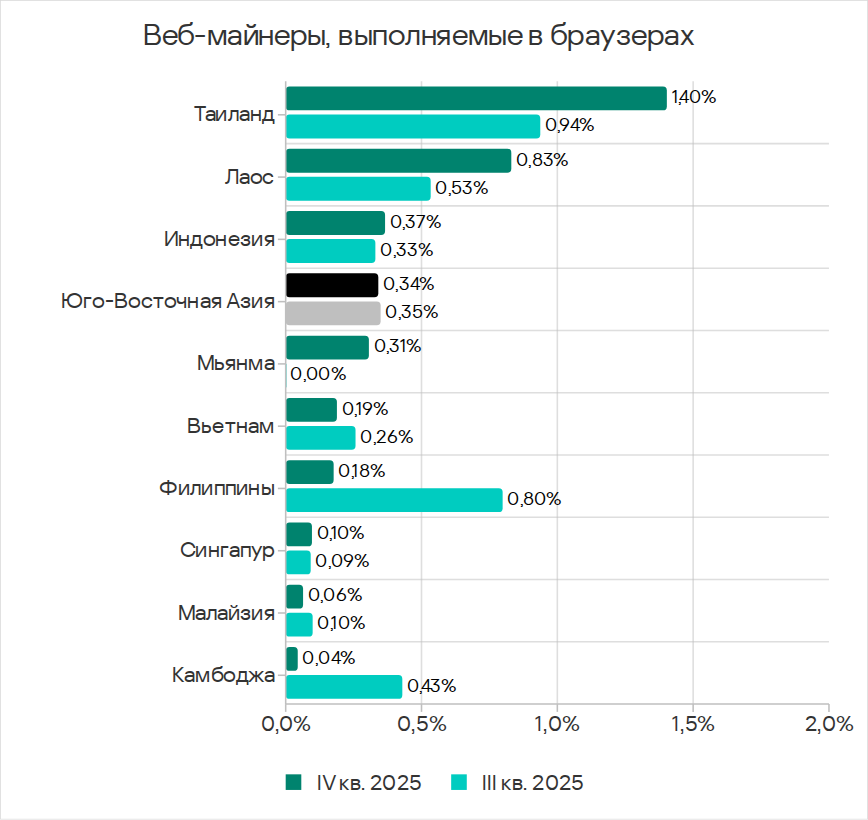 В четвертом квартале 2025 года по доле компьютеров АСУ, на которых были заблокированы веб-майнеры, Юго-Восточная Азия лидирует с 0,34%. Это в 5,7 раза больше показателя в Восточной Азии, которая замыкает рейтинг.