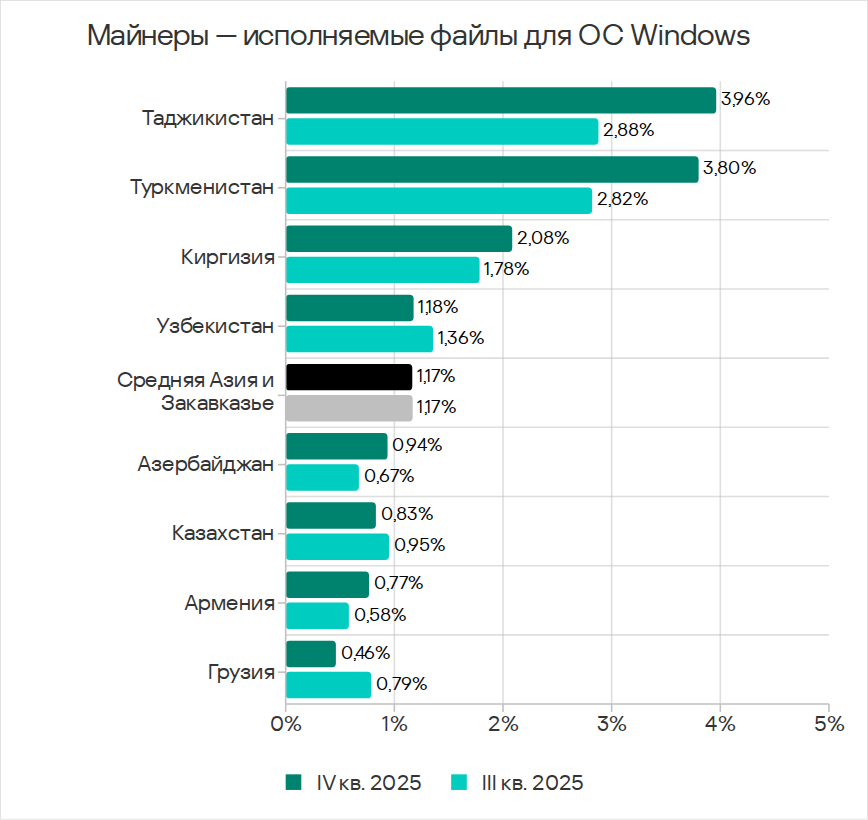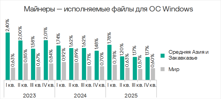 Важно отметить, что майнеры – исполняемые файлы для ОС Windows распространяются, используя функциональность червей. Поэтому динамика показателей у майнеров — исполняемых файлов и червей в Средней Азии и Закавказье во многом схожа.