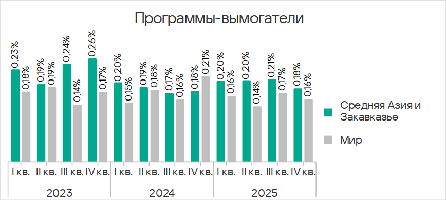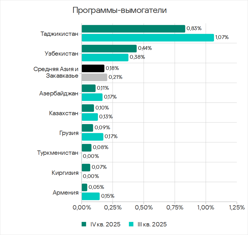 По доле компьютеров АСУ, на которых были заблокированы программы-вымогатели, Средняя Азия и Закавказье среди регионов занимают четвертое место с 0,18%. Этот показатель больше, чем в Северной Европе, которая замыкает соответствующий рейтинг, в 3,6 раза.