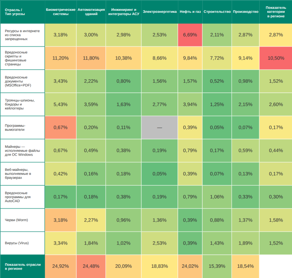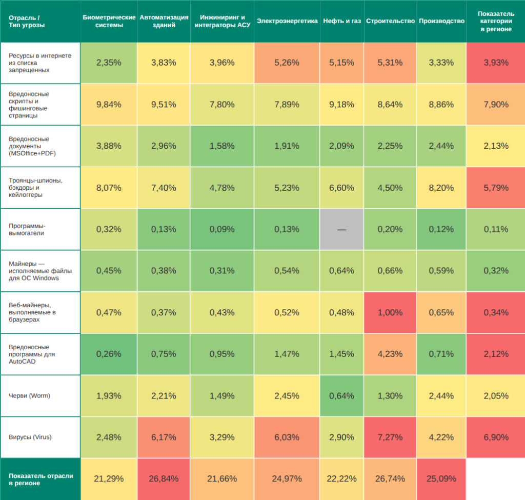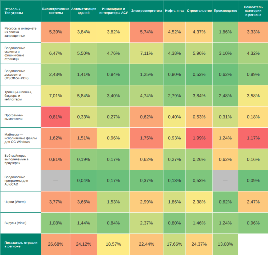Высок в отраслях региона и показатель программ-вымогателей – по нему Средняя Азия и Закавказье занимают не ниже третьего места среди регионов в рейтингах отраслей:
