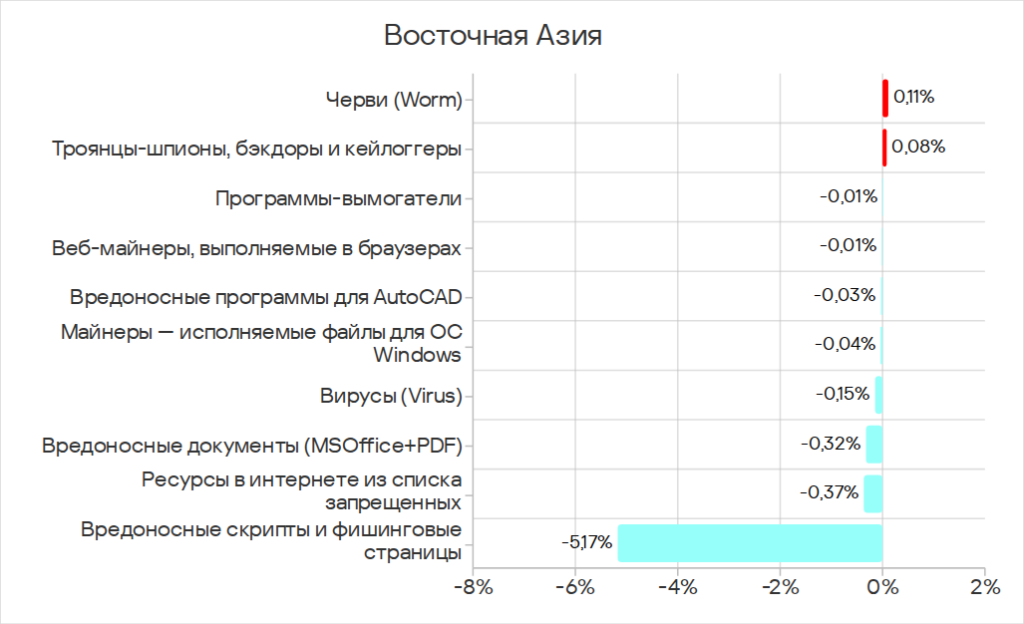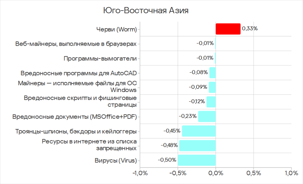 Особенностью региона является распространение через интернет не только традиционных для этого источника угроз, но и вирусов и вредоносных программ для AutoCAD. Эти категории угроз распространяются в Юго-Восточной Азии через все источники, но чаще в интернете.