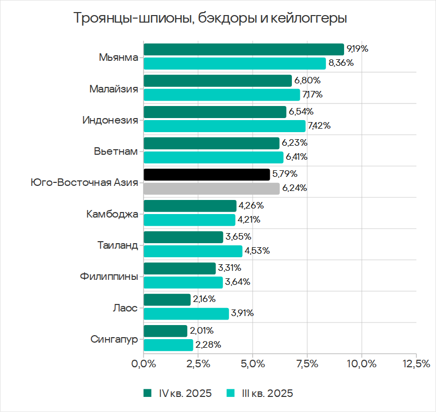 Среди стран региона по доле компьютеров АСУ, на которых были заблокированы угрозы в почтовых клиентах, с заметным отрывом лидирует Малайзия с 6,95%. Наименьшее значение в Лаосе — 0,83%.