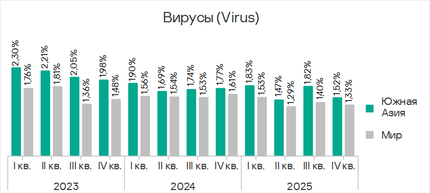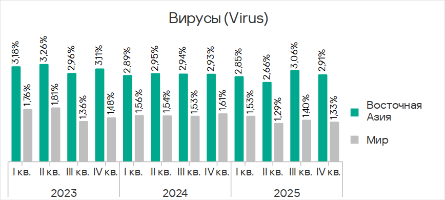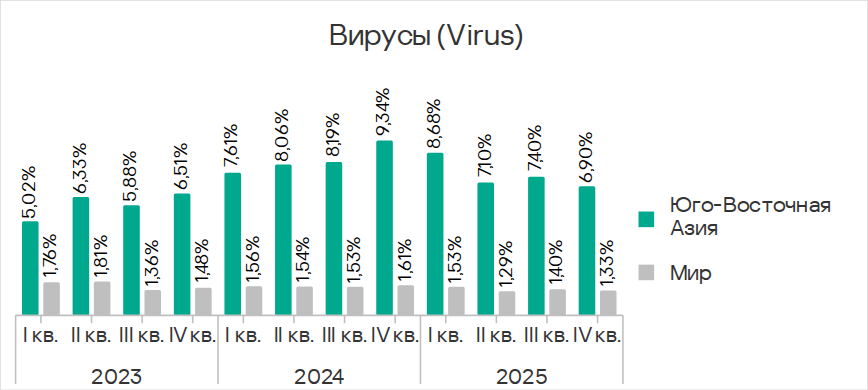 В Юго-Восточной Азии в рейтинге категорий угроз вирусы находятся на второй позиции. Это единственный регион, где эта категория угроз находится насколько высоко.