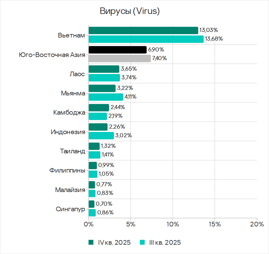 В Юго-Восточной Азии вирусы занимают второе место в региональном рейтинге категорий вредоносных программ по доле компьютеров АСУ, на которых они были заблокированы. Это самая высокая позиция вирусов в региональных рейтингах категорий угроз. В аналогичном мировом рейтинге вирусы находятся на шестом месте, в большинстве регионов — на шестом или седьмом.