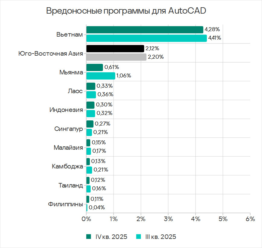 Лидерство региона по доле компьютеров АСУ, на которых были заблокированы вредоносные программы для AutoCAD, также обеспечивает Вьетнам с огромным для этой категории показателем 4,28%.
