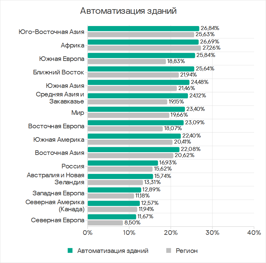 Средняя Азия и Закавказье находятся на шестом месте среди регионов по доле компьютеров АСУ, на которых были заблокированы вредоносные объекты в автоматизации зданий.