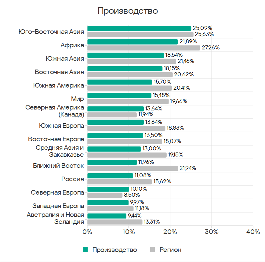 По доле компьютеров АСУ, на которых были заблокированы угрозы из интернета, Юго-Восточная Азия занимает второе место в рейтинге регионов с показателем, который превышает минимальный — у Северной Европы — в 2,4 раза.