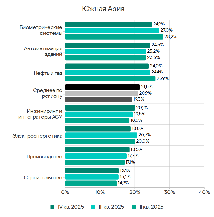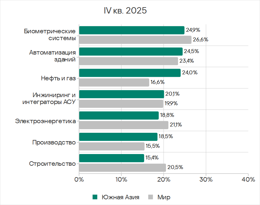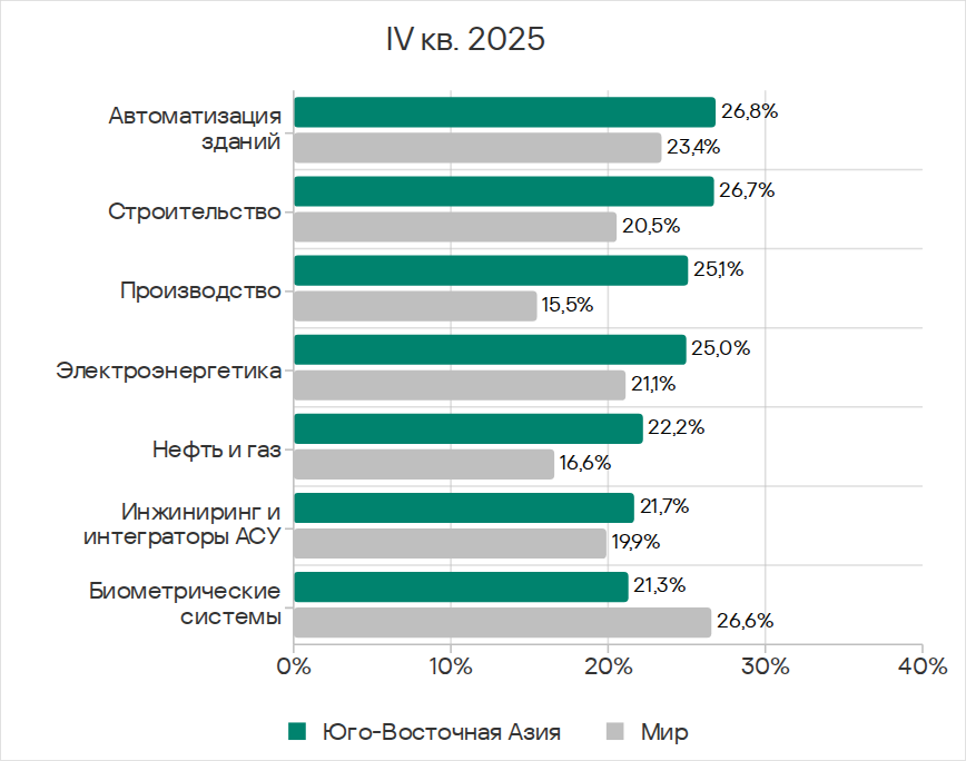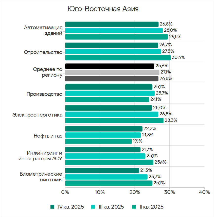 В четвертом квартале 2025 года среди регионов Юго-Восточная Азия лидирует по доле компьютеров АСУ, на которых были заблокированы вредоносные объекты в автоматизации зданий и производстве.