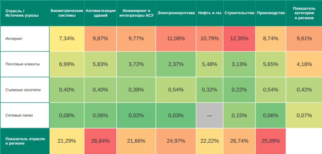 Среди отраслей в регионе автоматизация зданий – единственная, где на компьютерах АСУ были заблокированы угрозы в сетевых папках. Кроме того, она занимает: