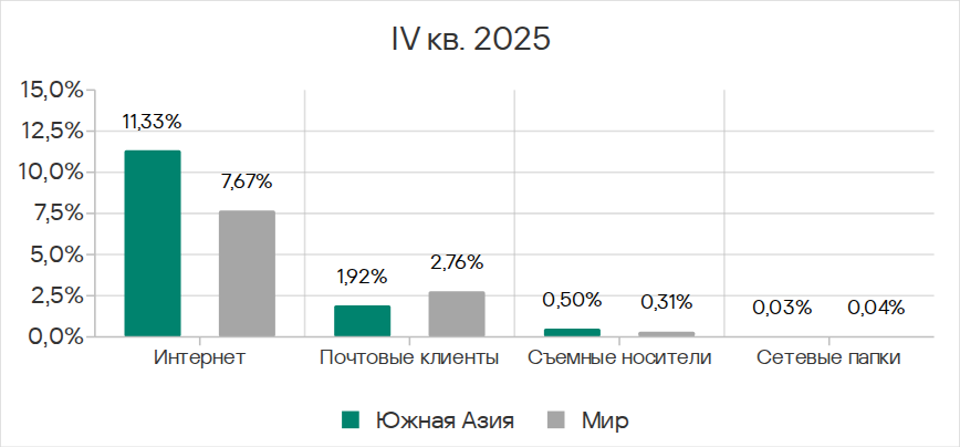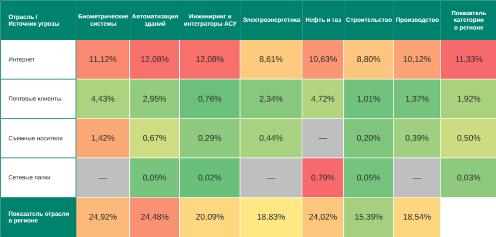 По показателям угроз из интернета и в сетевых папках Юго-Восточная Азия занимает второе место в соответствующих рейтингах регионов.