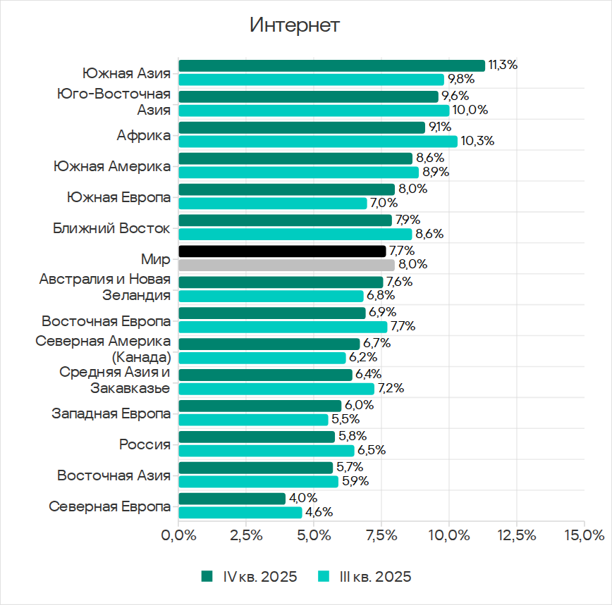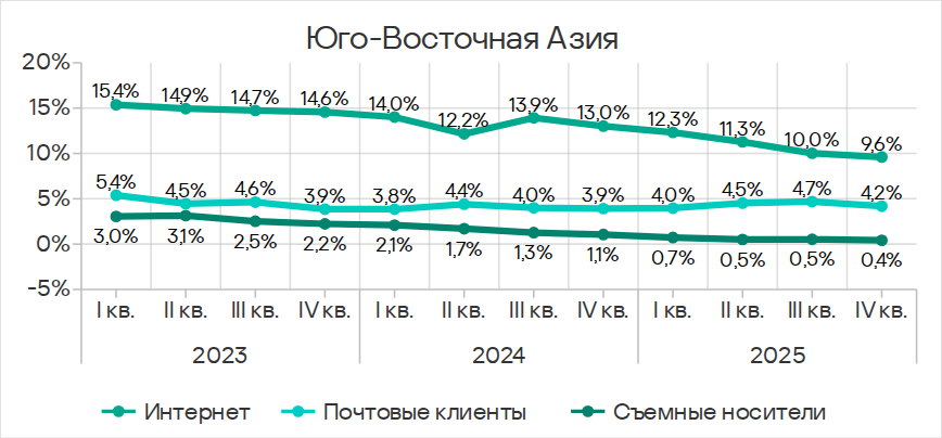 Отметим, что основным источником всех перечисленных выше угроз является интернет, а Юго-Восточная Азия находится на втором месте по показателю угроз из интернета.