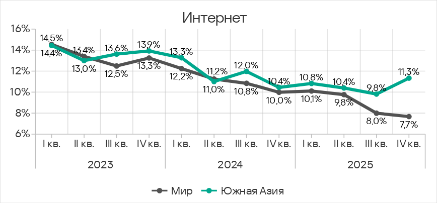 С 2024 года динамика показателя почтовых клиентов в регионе соответствует динамке среднемирового показателя. В четвертом квартале 2025 года он уменьшился после роста в течение трех предыдущих кварталов.