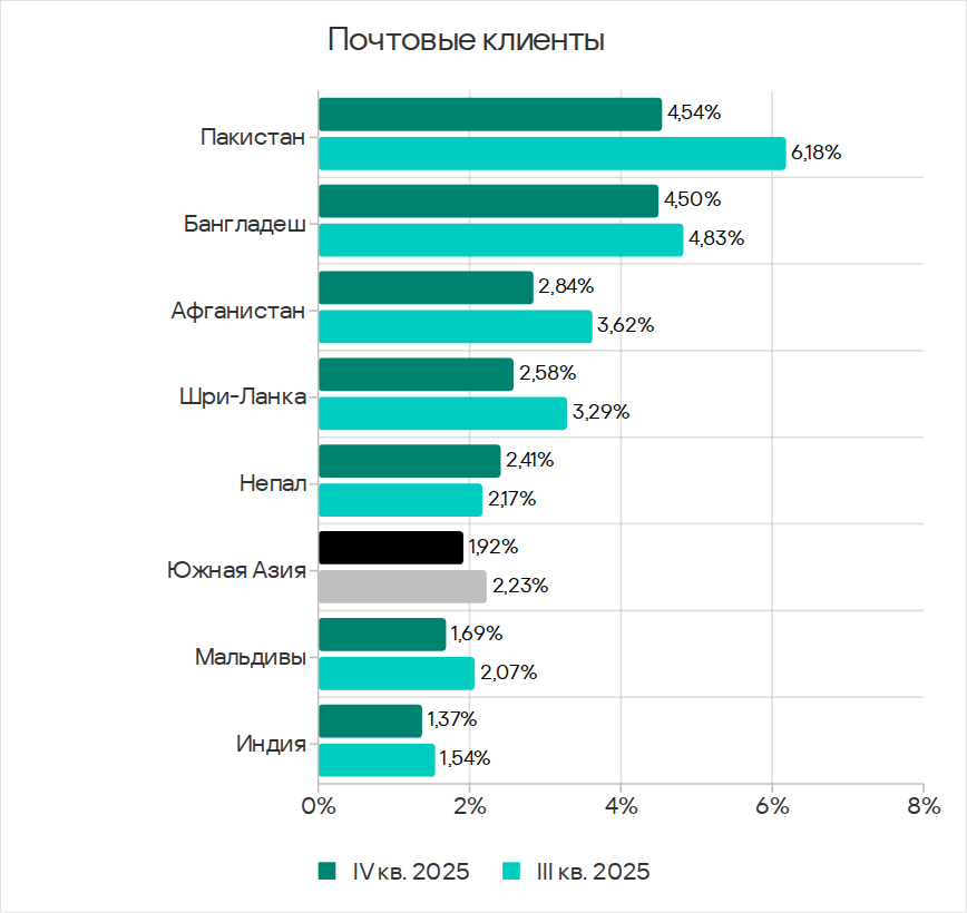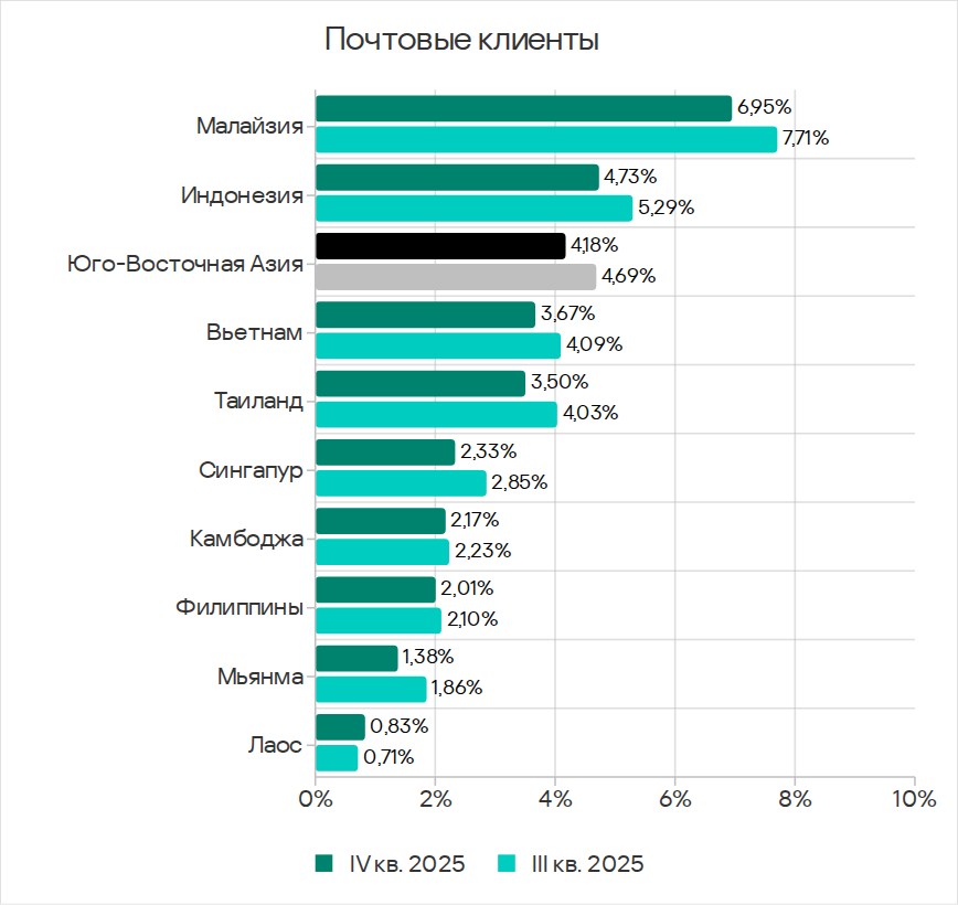 У Мьянмы и Лаоса, возглавляющих рейтинг по съемным носителям, наименьшие из всех стран региона показатели по угрозам в почтовых клиентах.