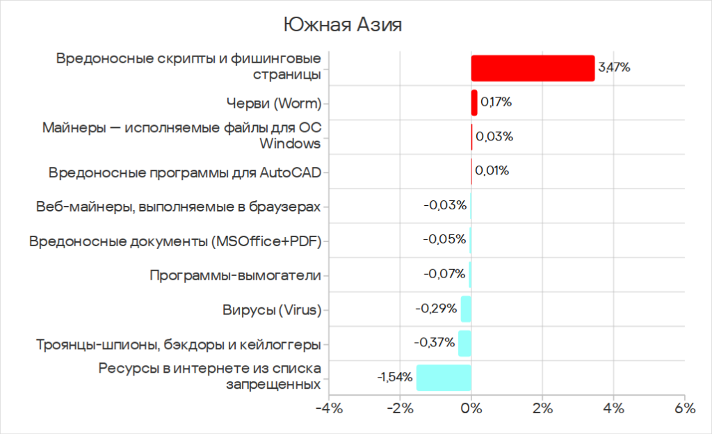 Основные категории угроз из интернета, которые блокируются на компьютерах АСУ в регионе: это вредоносные скрипты и фишинговые страницы, ресурсы в интернете из списка запрещенных, вирусы и веб-майнеры. По показателям вирусов и веб-майнеров Юго-Восточная Азия лидирует среди регионов.