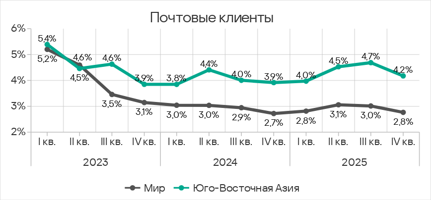 - первое место по показателю угроз из почтовых клиентов;