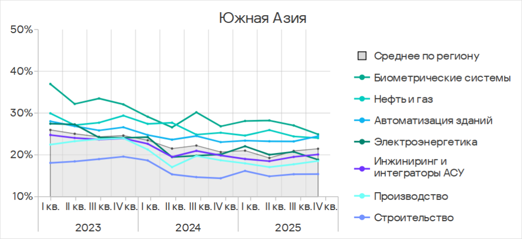 Во всех рассмотренных в отчете отраслях Средняя Азия и Закавказье лидируют по этому показателю среди регионов. Исключение составляет инжиниринг и интеграторы АСУ – в этой отрасли регион находится на втором месте.