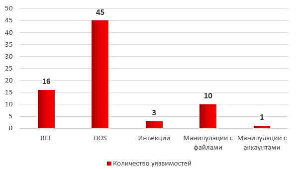 На рисунке ниже представлено распределение найденных уязвимостей по группам в соответствии с теми возможностями, которые дает использование уязвимости злоумышленникам.