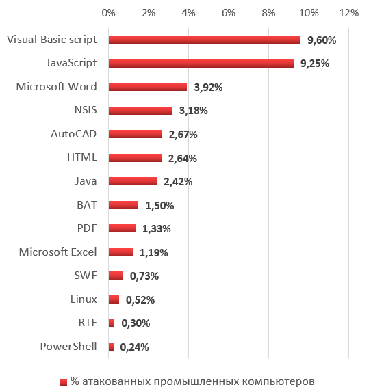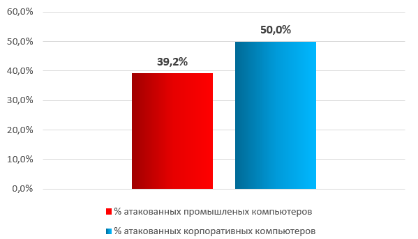 Отметим, что процент атакованных промышленных компьютеров меньше, чем аналогичный показатель по корпоративным компьютерам в целом.