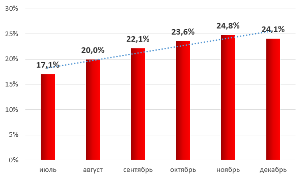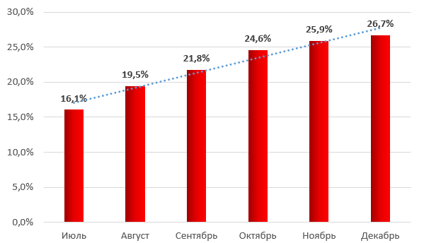Процент атакованных промышленных компьютеров по месяцам в мире (второе полугодие 2016)