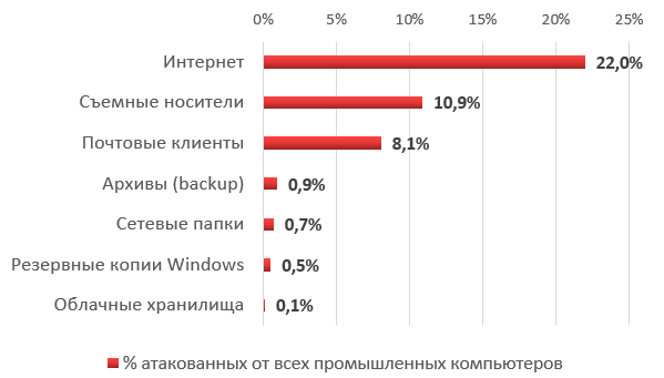 Важно отметить, что в рейтинге вредоносных программ, детектируемых на промышленных компьютерах, значительный процент атакованных промышленных компьютеров связан с попытками заражений программами классов Virus, Worm и Net-Worm (см. ниже). Вредоносные программы, относящиеся к этим классам, использует съемные носители и сетевые папки в качестве основных путей распространения. Поскольку зловреды часто маскируются под файловое окружение на съемном носителе, заражая существующие файлы или используя схожие имена, пользователь может долгое время не знать, что файлы заражены. (Такой же подход используется и при распространении вредоносного ПО через сетевые папки.) Пользователь может создавать защищенные архивы данных, в которые попадают эти файлы. Кроме того, зараженные файлы могут попадать в резервные копии файловой системы в процессе их создания операционной системой.