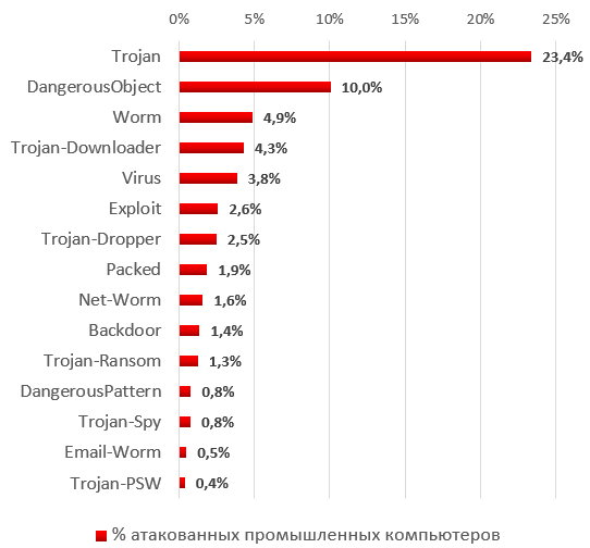 В большинстве случаев попытки заражения промышленных компьютеров носят случайный характер, а функции, заложенные во вредоносное ПО, не являются специфичными для атак на системы промышленной автоматизации. Таким образом, все те угрозы и категории программ, которые представляют опасность для компаний по всему миру, актуальны и для промышленных компаний. Среди них — троянцы-шпионы, финансовые зловреды, программы-вымогатели (включая шифровальщики), бэкдоры и программы типа Wiper (KillDisk), выводящие из строя компьютер и затирающие данные на диске.
