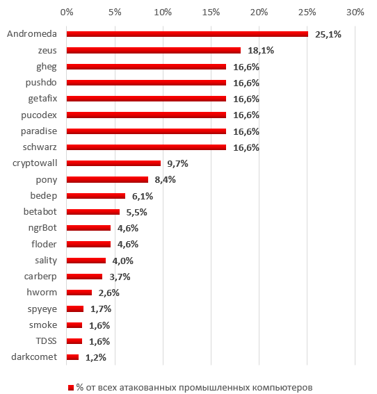 По нашим данным, во втором полугодии 2016 года наиболее распространенным семейством ботнет-агентов в промышленных сетях (25,1% от всех атакованных ботами промышленных компьютеров) оказалось вредоносное ПО Andromeda (Backdoor.Win32.Androm). Последнее время боты этого семейства часто используются для организации спам-рассылок, а также для загрузки на зараженный компьютер модулей, шифрующих файлы на жестком диске с целью получения денег за предоставление ключа для расшифровки.
